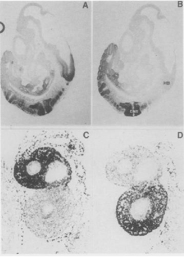 Figure 3. Day-10.5 mouse embryo sectioned parasagittally and stained with an antibody raised against the last 106 amino acids of the human homolog of the X1Hbox 1 gene (Oliver et al. 1988a). The protein is detected in anterior regions of the spinal cord beginning in the hindbrain (HB), in somites, and in mesoderm of the digestive tract. (B)The adjacent mouse section was immunostained with anti- Hox-5.2 antibody (raised against the last 73 amino acids of the protein). Nuclear staining is detected over the same tissue derivatives as X1Hbox 1, but its distribution is in more posterior regions of the embryo (e.g., this protein is absent in hindbrain and only the posteriordigestive tract is stained). The mutually exclusive expression pattern of both proteins is better seen in the two following panels. (CNS) Central nervous system. (C) Transverse section through an intestinal loop of a mouse embryo stained with X1Hbox 1 antibody. Staining is detected in the mesoderm of an anterior intestinal loop. (D) Adjacent section immunostained with anti-Hox-5.2 antibody; note that only the posterior intestinal loop is positive. These mutually exclusive staining patterns strongly support the specificity of the antibodies used in this analysis.