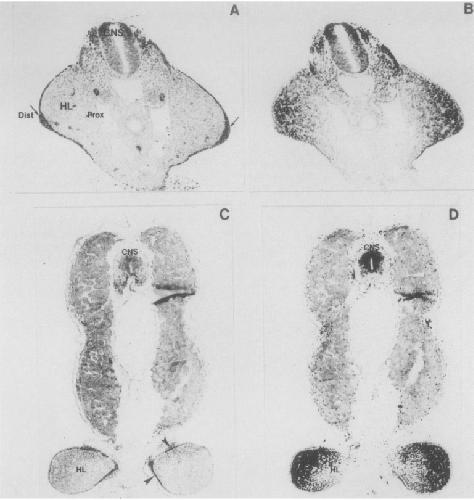 Figure 4. lmmunolocalization of Hox-5.2 antigens in developing hindlimb buds. (A) Day-10.5 mouse embryohindlimb buds (HL) sectioned transversely and stained with the X1Hbox I antibody raised against the human homolog (0liver et al. 1988b).As described previously, staining is detected only in the surrounding ectoderm (indicated by arrows). (B) Staining of an adjacent section with anti-Hox-5.2 antibody. Mesodermal cells exhibit a distal (Dist) to proximal (Prox)gradient of nuclear protein. {C}Transverse section at the level of the hindlimb buds of a Xenopus stage-50 tadpole (2-week)stained with Xenopus antibody B (Cho et al. 1988; 0liver et al. 1988a). As previously reported (0liver et al. 1988b), no mesodermal staining is detected in hindlimbs, while the medial region of the ectoderm shows expression (arrows).(D) An adjacent section was stained with anti-Hox-5.2 antibody and, as in mouse, the staining is observed in the mesoderm in a distal to proximal gradient. (CNS) Central nervous system.