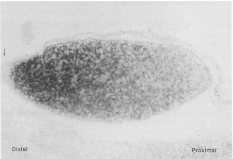 Figure 6. Section through a stage-25 chicken forelimb showing a clear nuclear gradient of Hox-5.2 antigen. In this oblique section Hox-5.2 gradient is maximal in the distal (and posterior) region, and minimal in the proximal (and anterior) region of the limb bud. The arrow indicates the apical ectodermic ridge, a thickening of the ectoderm involved in limb growth.