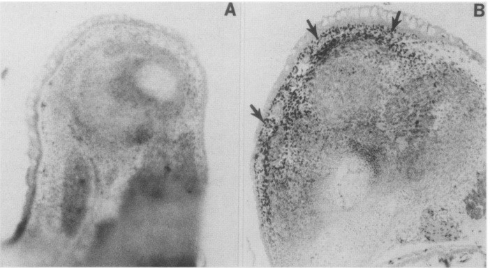 Figure 7. Activation of Hox-5.2 protein during limb regeneration. (A) Normal hindlimb bud from a stage-54 Xenopus tadpole (oblique section). Very weak staining is detected with Hox-5.2 antibody. (B) Contralateral hindlimb bud amputated distally 8 days previously (stage 52). Note that Hox-5.2 antigen is strongly expressed in the regeneration blastema (arrows).