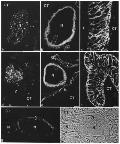 is shown (L, lumen). g, h Similar nerve structures as in a, b, d and e but stained with desmoplakin antibodies (same as in Fig. 2j),