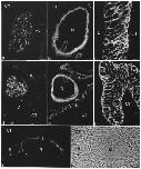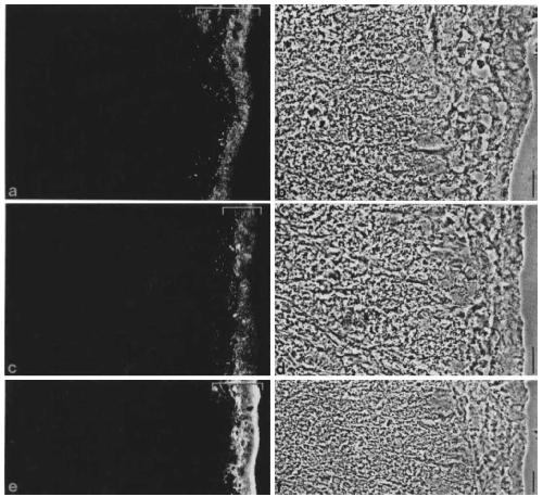 is shown in a, c, e, the corresponding phase-contrast photographs are shown in b, d, f. Bars, 20 pm