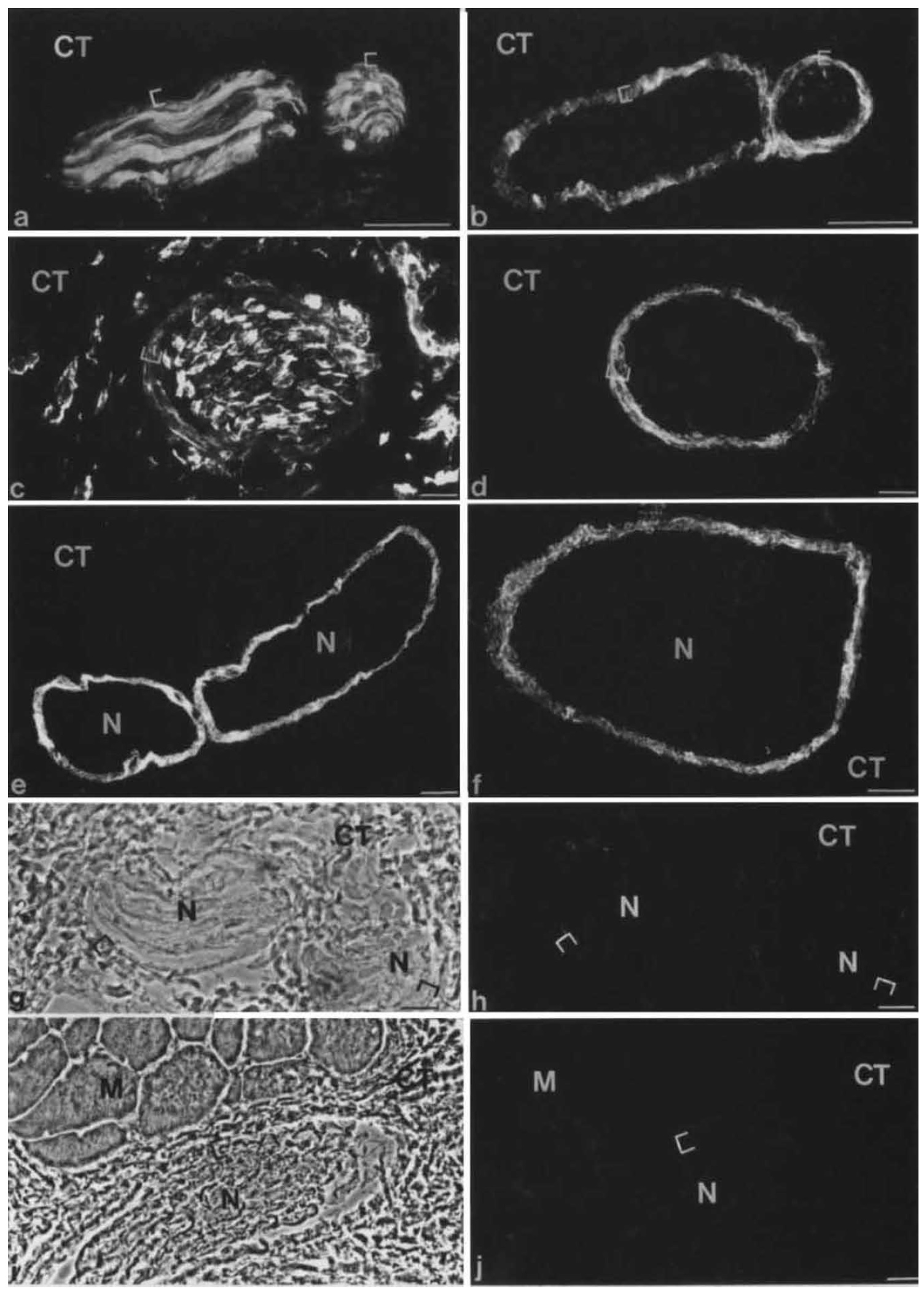 showing specific localization of desmosomes in the perineurium (brackets). All bars, 20 pm