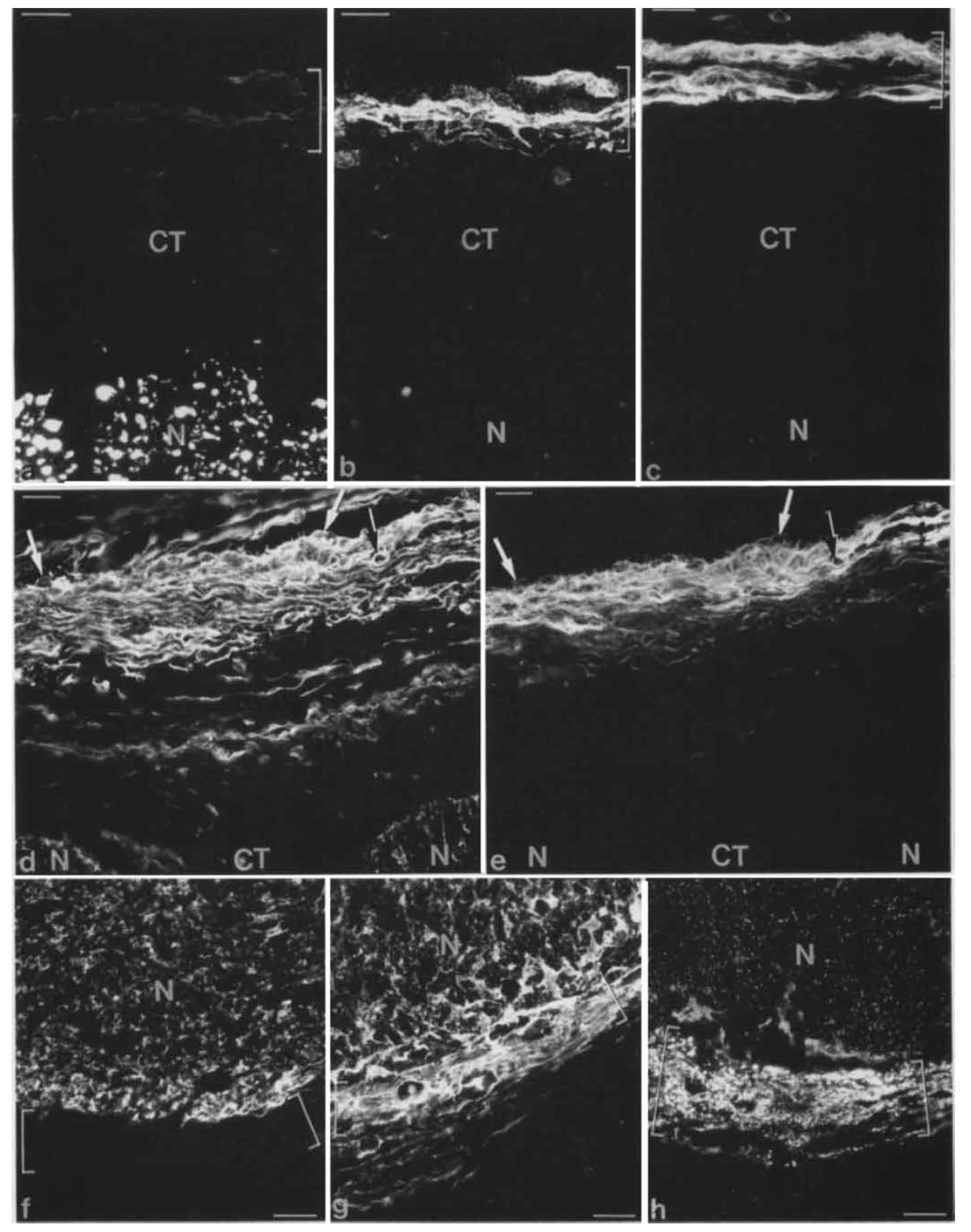 of neurofilament proteins in the axons of the optic nerve (N; b) but not in the arachnoidal cell layers (bracket), whereas guinea-pig