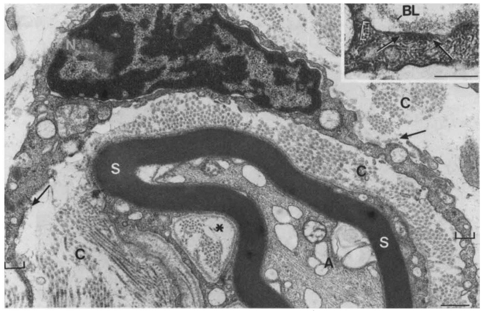 perineurial cell (demarcated by the brackets at the left and right margin; N, nucleus) surrounds a myelinated axon (A; S, Schwann