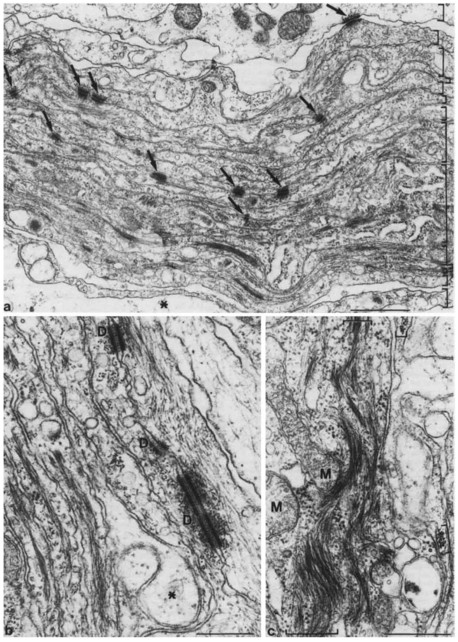 desmosomes (D) and subplasmalemmal densities (denoted by arrowheads).