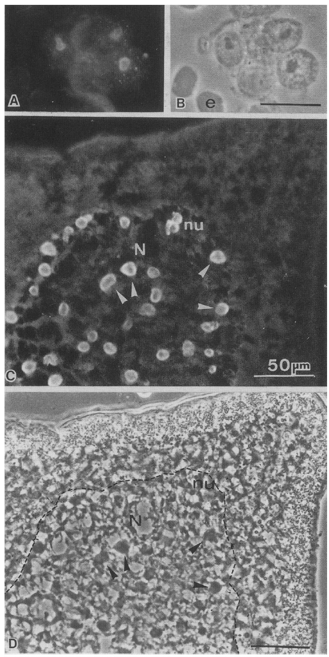 strongly fluorescent. (D) Phase contrast: the nucleus is circled.