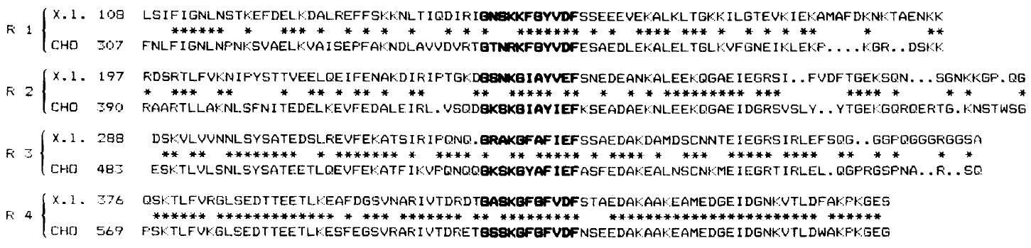 Figure 5. Alignment of the four RNA-binding domains of Xenopus nucleolin with those of CHO nucleolin (R I to R IV). Numbers on