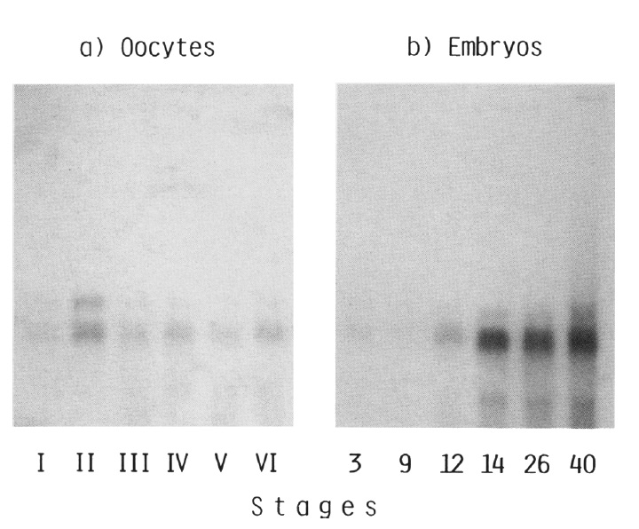 autoradiographed for 4 hr at room temperature. (Lanes 8-32) Embryo stages. Numbers in the middle refer to the peptides in kD.