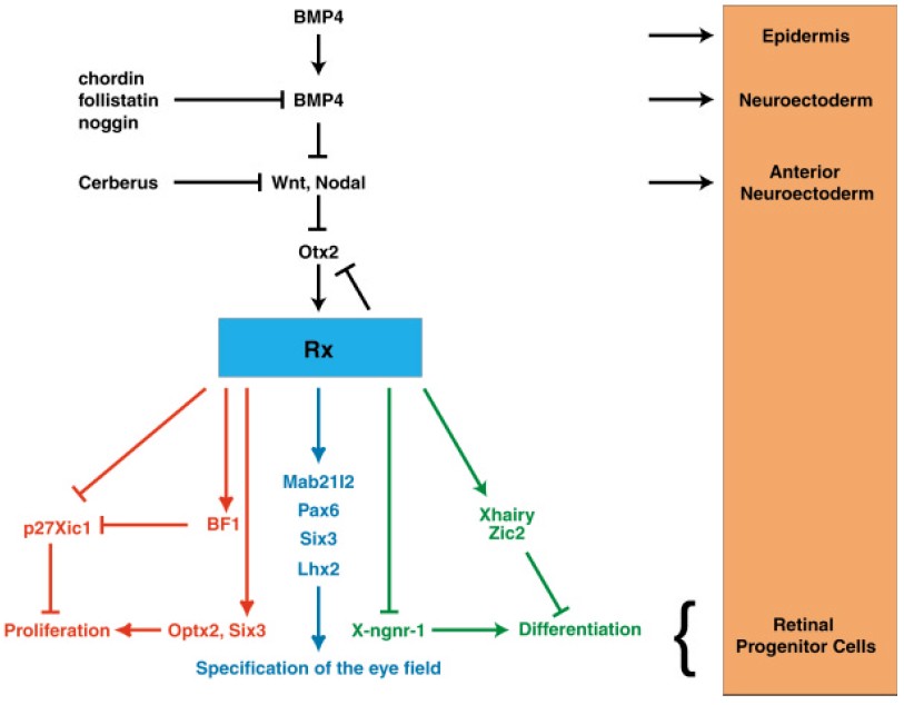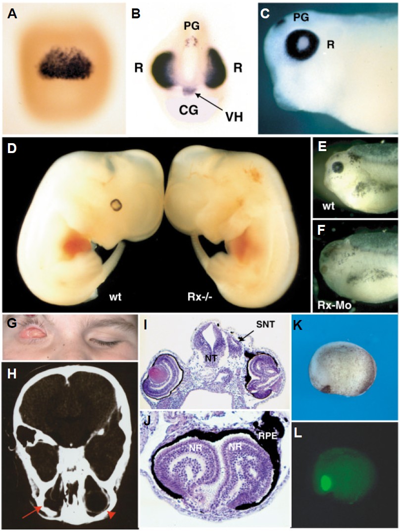 The paired-like homeobox-containing gene Rx has a critical role in the eye development of several vertebrate species including Xenopus, mouse, chicken, medaka, zebrafish and human. Rx is initially expressed in the anterior neural region of developing embryos, and later in the retina and ventralhypothalamus. Abnormal regulation or function of Rx results in severe abnormalities of eye formation. Overexpression of Rx in Xenopus and zebrafish embryos leads to overproliferation of retinal cells. A targeted elimination of Rx in mice results in a lack of eye formation. Mutations in Rx genes are the cause of the mouse mutation eyeless (ey1), the medaka temperature sensitive mutation eyeless (el) and the zebrafish mutation chokh. In humans, mutations in Rx lead to anophthalmia. All of these studies indicate that Rx genes are key factors in vertebrate eye formation. Because these results cannot be easily reconciled with the most popular dogmas of the field, we offer our interpretation of eye development and evolution.
