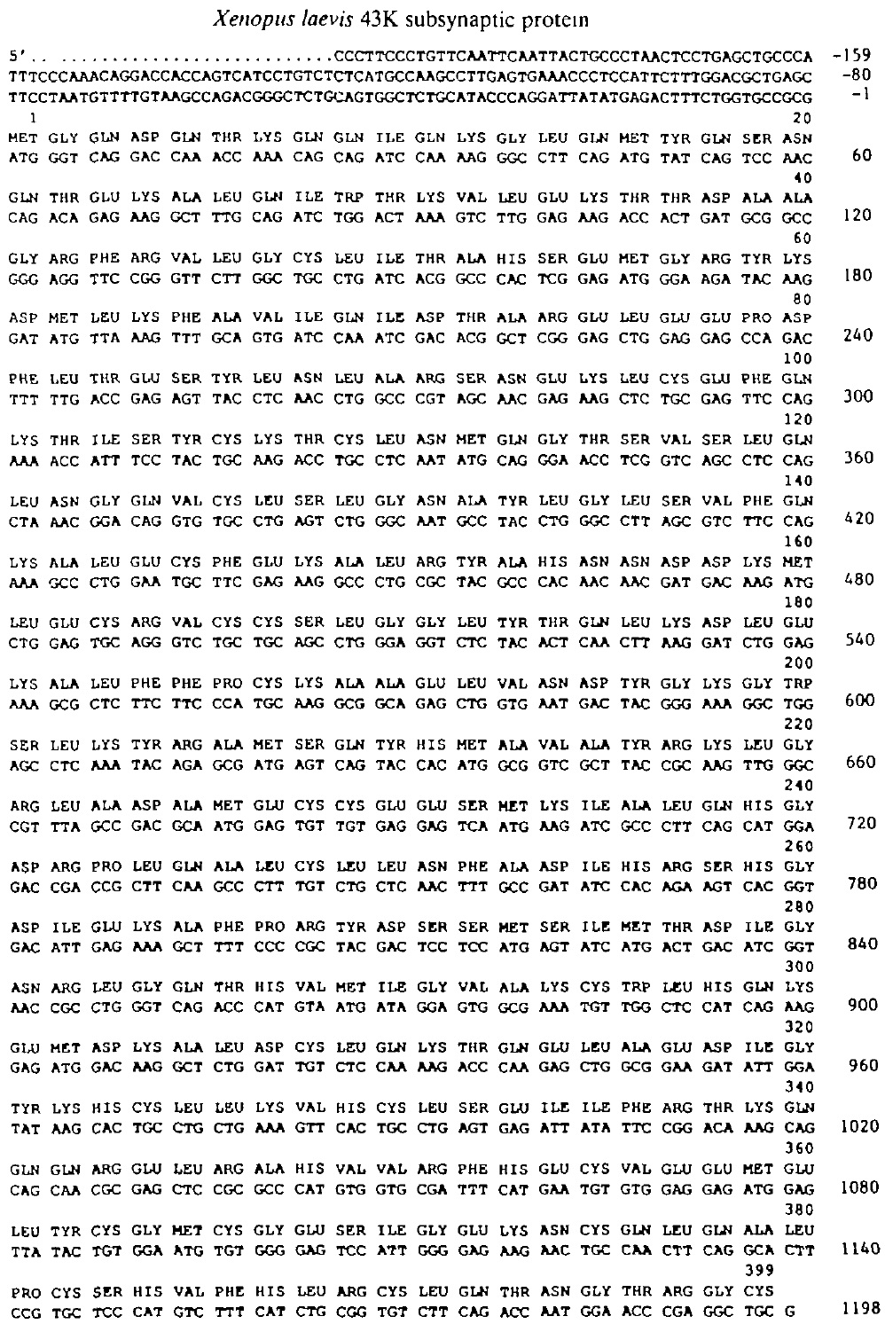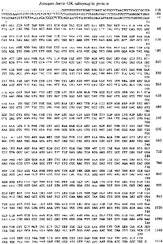Fig. 2. Alignment of the amino acid sequences of the Xenopus laevis and Torpedo californica 43K proteins. The