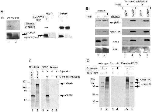 Figure 1Interactions among CPEB, Symplekin, and CPSF. (A) Extracts from stage VI Xenopus oocytes were subjected to immunoprecipitation with CPEB antibody or a nonspecific IgG that served as a control (NB, all protein coimmunoprecipitation buffers contained RNase A). Western blots of the precipitated proteins were probed for symplekin and CPEB. Some oocytes were also injected with mRNA encoding myc-CPEB; myc antibody immunoprecipitates were probed for the myc epitope and symplekin, as were untreated extracts.