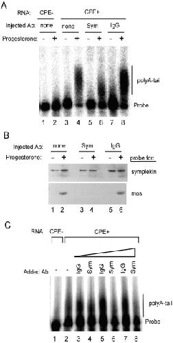 Figure 2 Symplekin Is Required for Cytoplasmic Polyadenylation. (A) Oocytes were injected with symplekin antibody or a control IgG and incubated for 12â16 hr. A radiolabeled RNA probe containing or lacking a CPE was injected and the oocytes further incubated in the absence or presence of progesterone. The RNA was isolated and resolved on a 6% denaturing gel.