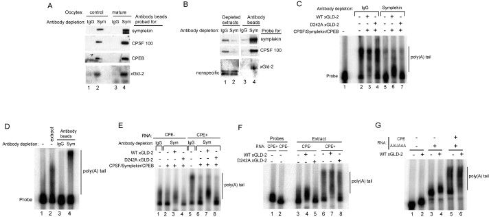 (A) Extracts prepared from control or progesterone-matured oocytes were subject to immunodepletion with symplekin antibody or control IgG. Western blots of the antibody-containing beads were probed for symplekin, CPSF100, CPEB, and xGLD-2.