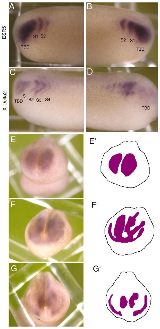Fig. 4. EDEN-BP morpholinos alter presegmentation in the PSM. Embryos were injected in one blastomere at the two-cell stage with 25 ng of each EDEN-BP morpholino. (A-D) Lateral views of stage 25/26 embryos stained for ESR5 (A,B) or X-Delta2 (C,D). (A,C) Non-injected sides, and (B,D) injected sides of the same embryos. TBD, tailbud domain. S1 to S4, Somitomeres 1 to 4. (E-G) Posterior views of stage 20 embryos stained for ESR9, representative of phase I (E), II (F) and III (G) of the dynamic mode of expression of ESR9. (Eâ²-Gâ²) Schematic drawings of E-G.