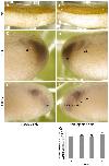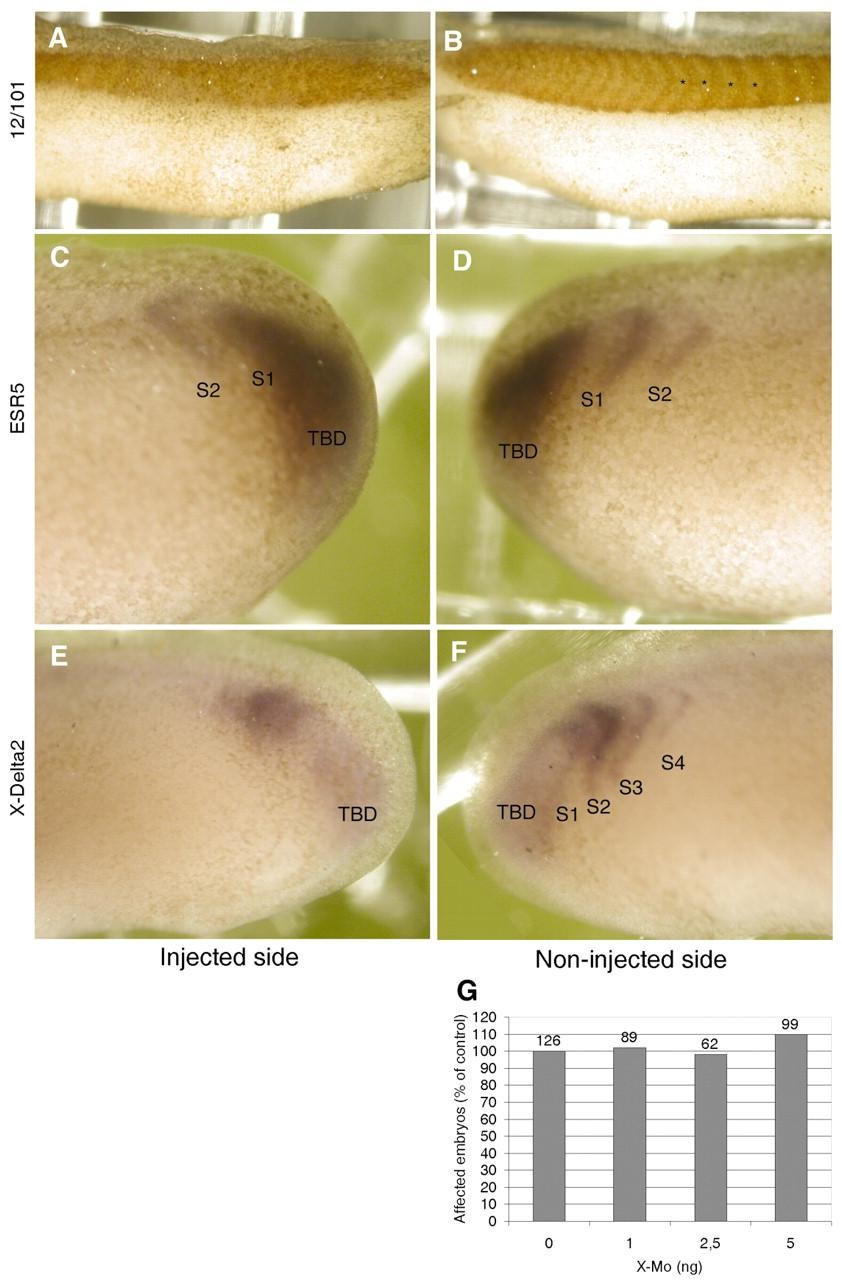 Fig. 6. Evidence for other targets of EDEN-BP than XSu(H) in the segmentation process. (A-F) Embryos were injected in one blastomere at the two-cell stage with 2 fmol of XSu(H)1 mRNA. They were allowed to develop to stage 28 (A,B) or stage 26 (C-F), and then stained with the 12/101 monoclonal antibody (A,B), or stained with the ESR5 (C,D) or X-Delta2 (E,F) probes. (A,C,E) Injected sides, and (B,D,F) non-injected sides of the same embryos. Asterisks highlight successive somites in B. TBD, tailbud domain; S1 to S4, somitomeres 1 to 4. (G) Embryos were injected with 25ng of each E-Mo, and 0, 1, 2.5 or 5 ng of each X-Mo as indicated. The graph represents the percentage of abnormally segmented embryos, normalized to 100% for the embryos injected with E-Mo only. The total number of embryos examined for each of these conditions is indicated above each bar.