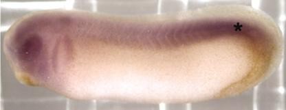 Fig. 1. Expression pattern of EDEN-BP during Xenopus early development. Embryos were collected at different stages: neurula, stage 18 (A); tailbud, stage 25 (B,C,G) and stage 27 (D,F); tadpole, stage 31 (E). (A) Dorsal view, (B-G) lateral views; anterior left. Embryos were processed for whole-mount in situ hybridization using an EDEN-BP antisense (A,B,D,E), or sense (C) probe, or for whole-mount immunohistochemistry using an anti-EDEN-BP antiserum (F), or the corresponding pre-immune serum (G). The asterisks in B, D, E and F highlight the higher amount of EDEN-BP mRNA or protein in the presomitic mesoderm.