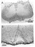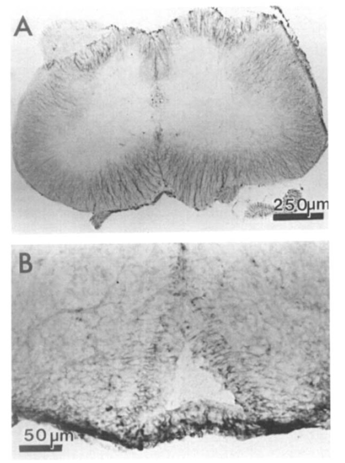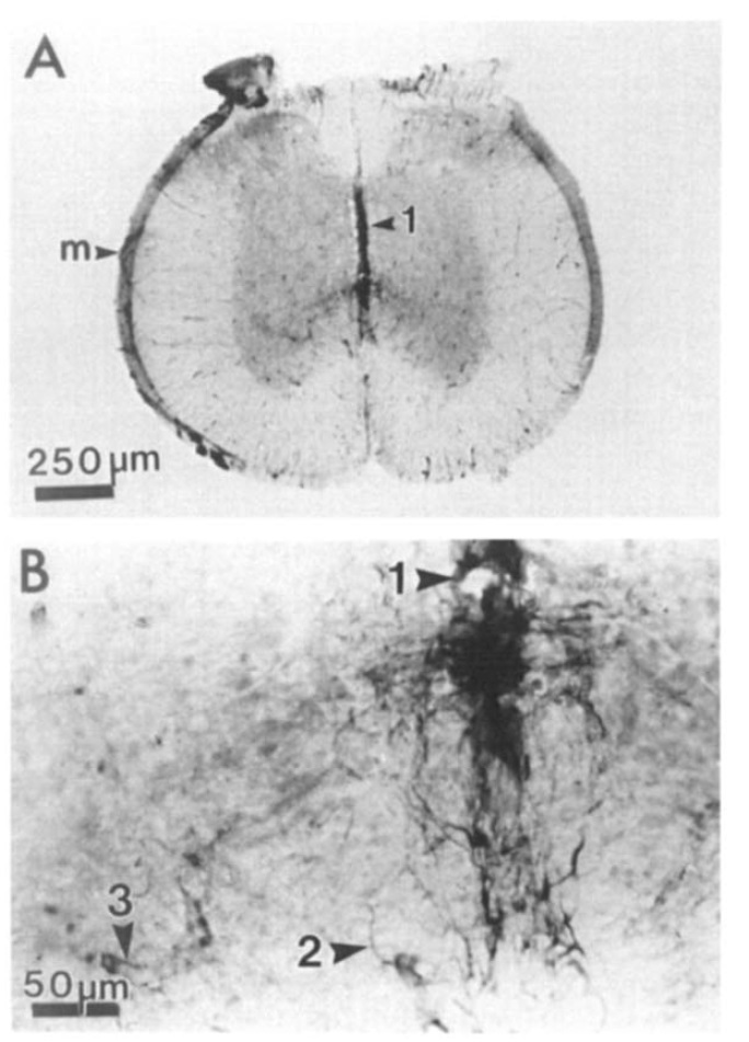frogs. A: radially oriented processes and their associated pial attachments (arrow) in the dorsal white matter of the spinal cord from a