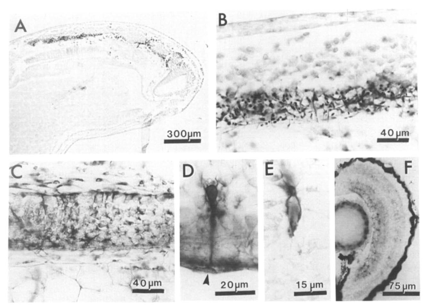 the metencephalon of a paraffin embedded stage 42 tadpole. Its processes appeared to be attached to an apparent blood vessel. F: