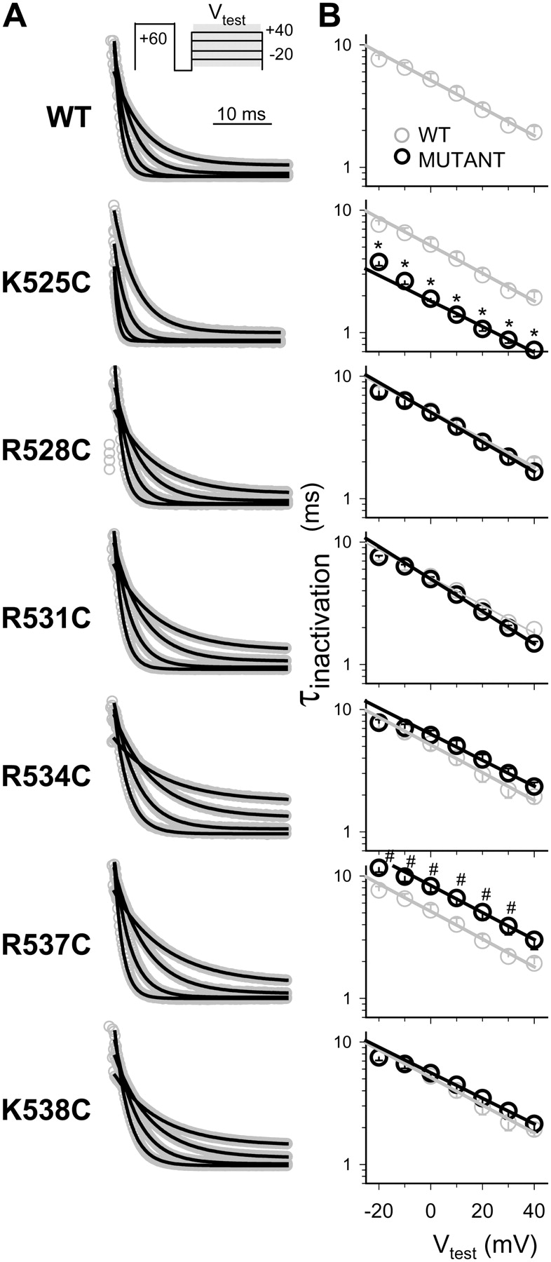 The hERG channel has a relatively slow activation process but an extremely fast and voltage-sensitive inactivation process. Direct measurement of hERG's gating current (Piper, D.R., A. Varghese, M.C. Sanguinetti, and M. Tristani-Firouzi. 2003. PNAS. 100:10534-10539) reveals two kinetic components of gating charge transfer that may originate from two channel domains. This study is designed to address three questions: (1) which of the six positive charges in hERG's major voltage sensor, S4, are responsible for gating charge transfer during activation, (2) whether a negative charge in the cytoplasmic half of S2 (D466) also contributes to gating charge transfer, and (3) whether S4 serves as the sole voltage sensor for hERG inactivation. We individually mutate S4's positive charges and D466 to cysteine, and examine (a) effects of mutations on the number of equivalent gating charges transferred during activation (z(a)) and inactivation (z(i)), and (b) sidedness and state dependence of accessibility of introduced cysteine side chains to a membrane-impermeable thiol-modifying reagent (MTSET). Neutralizing the outer three positive charges in S4 and D466 in S2 reduces z(a), and cysteine side chains introduced into these positions experience state-dependent changes in MTSET accessibility. On the other hand, neutralizing the inner three positive charges in S4 does not affect z(a). None of the charge mutations affect z(i). We propose that the scheme of gating charge transfer during hERG's activation process is similar to that described for the Shaker channel, although hERG has less gating charge in its S4 than in Shaker. Furthermore, channel domain other than S4 contributes to gating charge involved in hERG's inactivation process.