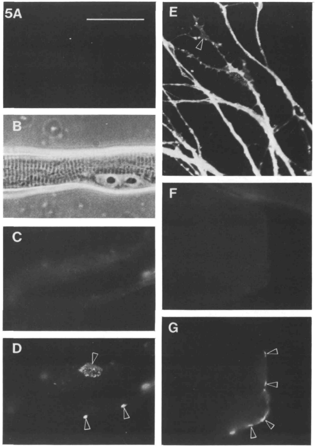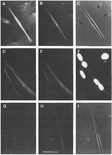 (arrowhead). G-I shows a myoblast stained with preimmune serum (G) or R-BTX (H), and the corresponding phasecontrast