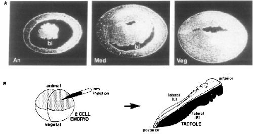 (B) Cartoon to indicate that the first cleavage furrow of the developing egg can bisect the embryo into two lateral halves (Klein, 1987). In these cases, injection into one of the two blastomeres results in the left or the right side of the embryo receiving the RNA. (L) indicates the left, and (R) indicates the right lateral side