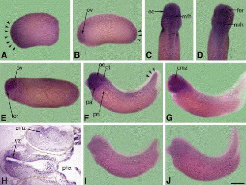 of the CNS. Expression can also be seen in the lens, the lining of the pharynx, and the ciliary marginal zone of the retina. (I) Sense control stage 33 embryo. (J)