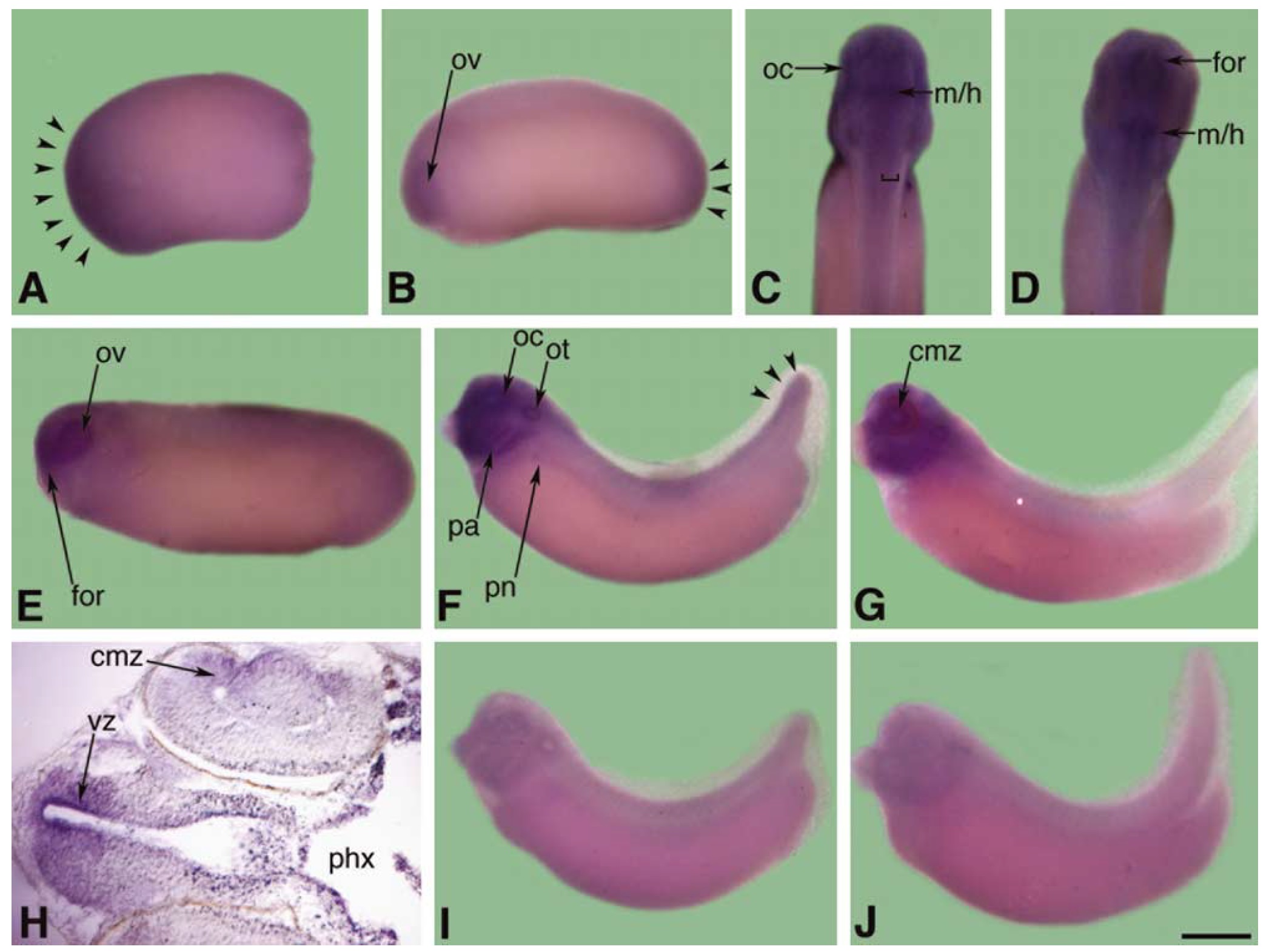 Fig. 5. Expression of Psf3. All embryos are oriented anterior to the left and dorsal to the top, except those in (C and D) which are dorsal views oriented anterior to the top. (A) Stage 13 embryo. Arrowheads demarcate anterior and posterior regions of neural expression. (B) Stage 22 embryo. (C) Stage 32 embryo. The bracket demarcates the right half of the CNS, and the left margin of the bracket aligns with the inner boundary of the ventricular zone. (D) Stage 37 embryo. (E) Stage 26 embryo. (F) Stage 32 embryo. (G) Stage 37 embryo. (H) Section through a stage 37 embryo at the level of the hindbrain, with the dorsum oriented to the left. Note the consistent levels of expression in the dorsal CNS compared to Psf1 (Fig. 3H) and Psf2 (Fig. 4I). (I) Sense control stage 30 embryo. (J) Sense control stage 37 embryo. All labels follow that listed in the legend to Fig. 1. The scale bar in G equals 380 mm in (A), 550 mm in (B) and (EâG), (IâJ), 200 mm in (C and D), and 125 mm in (H).