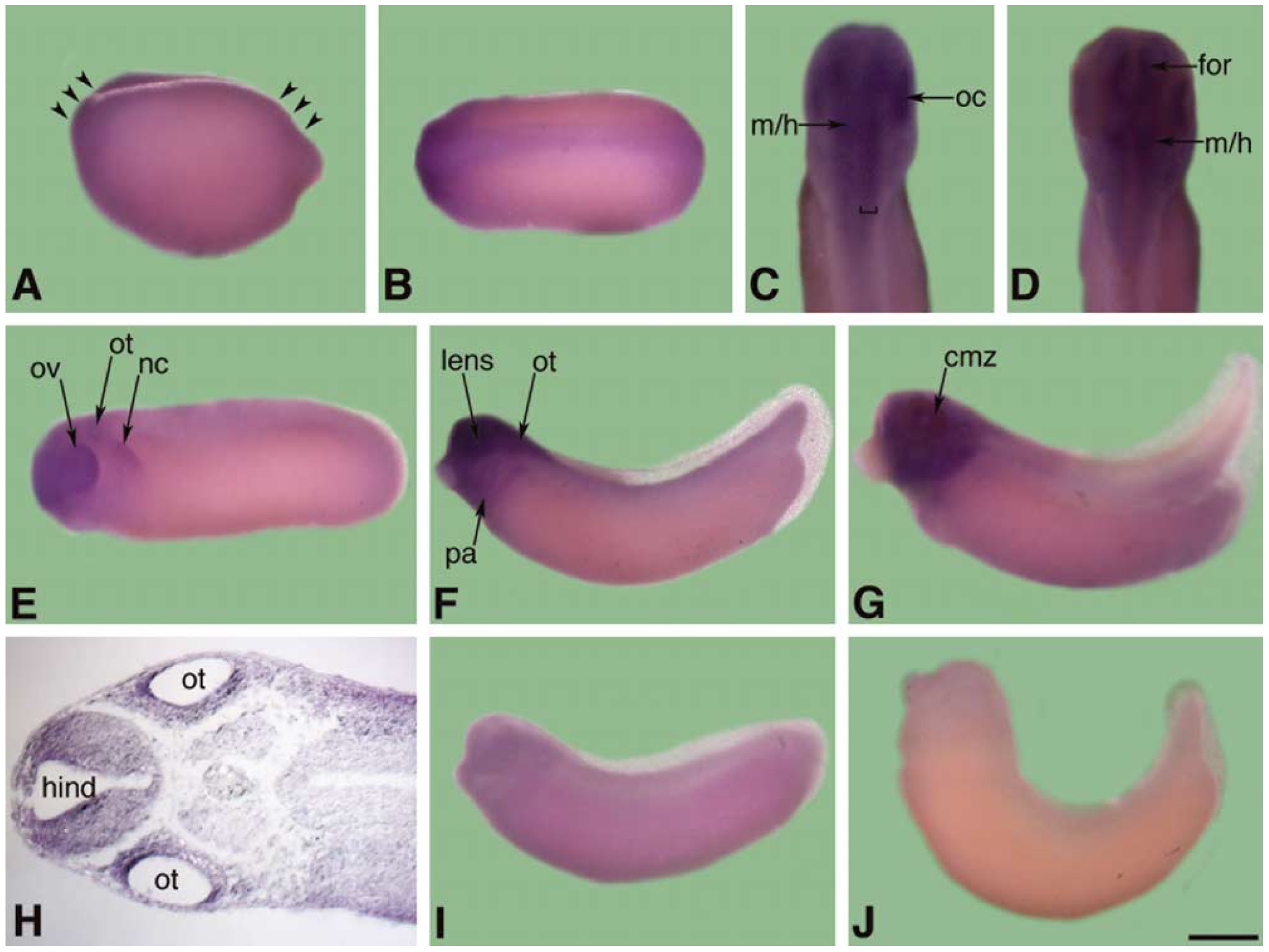level of the midbrain, with the dorsum oriented to the left. (I) Sense control stage 31 embryo. (J) Sense control stage 37 embryo. m/h: midbrain/hindbrain