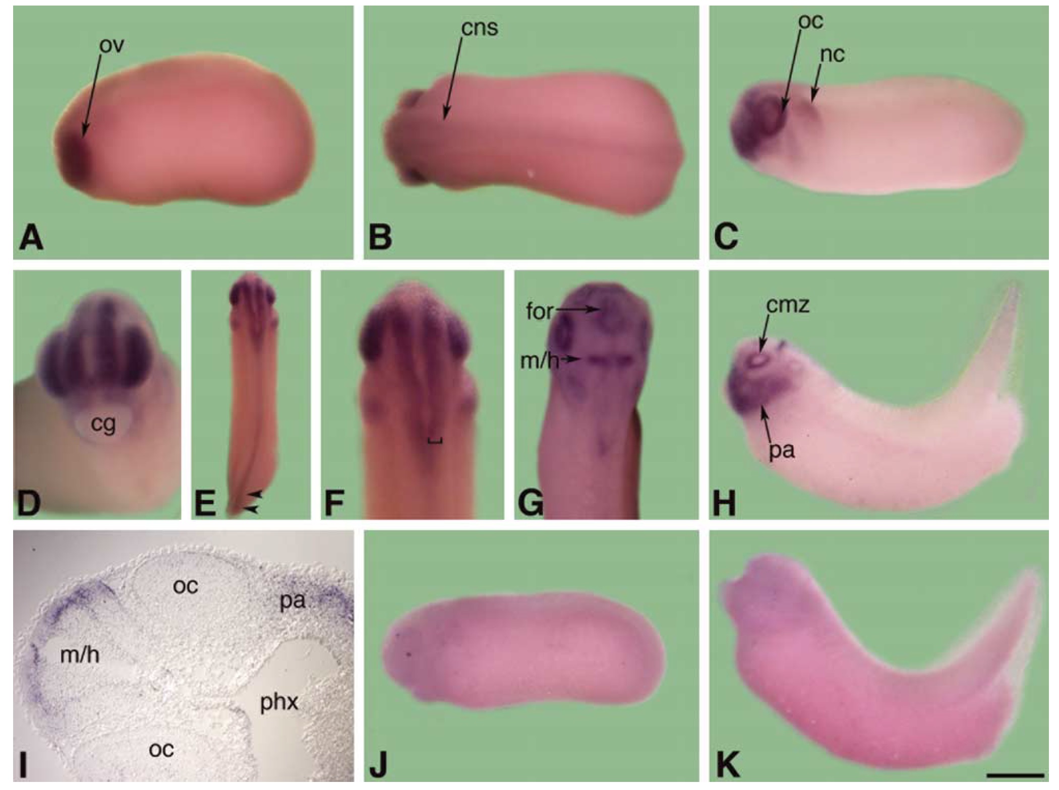 Fig. 6. Expression of PCNA. The embryos in (A and C), (H), and (J and K) are oriented anterior to the left and dorsal to the top; (B) is a dorsal view, oriented anterior to the left; those in (EâG) are dorsal views oriented anterior toward the top. (A) Stage 20 embryo. (B) Stage 22 embryo. (C) Stage 26 embryo. (D) Stage 26 embryo, anterior view with dorsal located to the top. (E) Stage 28 embryo. Arrowheads demarcate stronger signal in the tailbud region. (F) Stage 28 embryo. (G) Stage 37 embryo. The bracket demarcates the right half of the CNS, and the left margin of the bracket aligns with the inner boundary of the ventricular zone. (H) Stage 37 embryo. The stain in the midbrain is located at the midbrainâhindbrain boundary. (I) Section through a stage 37 embryo at the level of the midbrain/hindbrain boundary, with the dorsum oriented to the left. This section was taken from the temporal margins of the optic cup, and therefore does not include any ciliary marginal zone stain. (J) Sense control stage 23 embryo. (K) Sense control stage 37 embryo. cg: cement gland, cns: central nervous system, m/h: midbrain/hindbrain boundary. All other labels follow that listed in the legend to Fig. 1. The scale bar in (G) equals 430 mm in (A and B), 550 mm in (C), 250 mm in (D), 690 mm in (E), 780 mm in (F), and 200 mm in G, 380 mm in (H),(J and K), and 100 mm in (I).