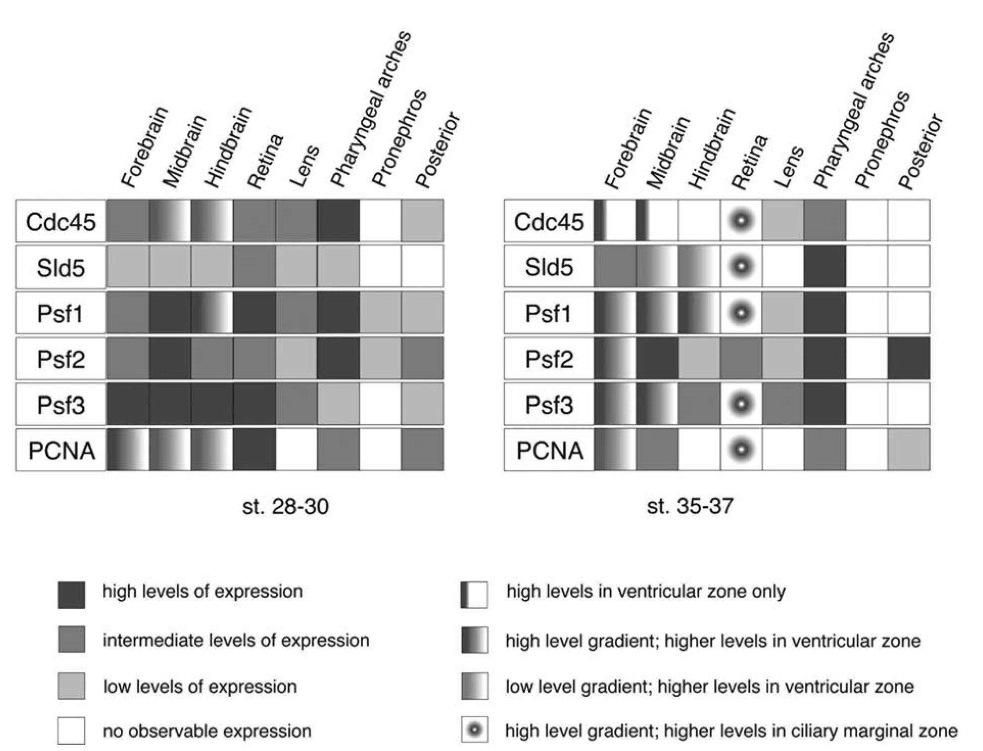 Fig. 7. Summary of expression in selected tissues between stages 28–30 and 35–37.