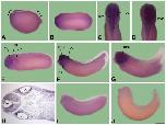 Fig. 1. Expression of cdc45. Embryos in (A) as well as (FâH) are oriented anterior to the left and dorsal to the top. (A) Stage 13 embryo. Arrowheads demarcate