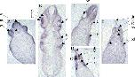 Fig. 4. Spatial expression profile of X-CypA during development. Whole-mount in situ hybridisation with an X-CypA DIG-labelled antisense RNA probe was performed on embryos from stages 9â39 as indicated in the figure. Expression was first detected in the nervous system from stage 15 (B), with apparent highest expression in the anteriorforebrain. This distribution persists throughout neurulation and early tailbud stages (CâE). At stage 26, X-CypA expression appears in the sensory organs including the eyes and otic vesicles and is maintained throughout their organogenesis (FâL). From stage 28, the gene is expressed in the pronephric kidney (H, I and M). At stage 39, expression can be clearly detected in the developing lateral line system (F). Panels AâC show embryos cleared in Murrays, panels D, KâM are uncleared embryos and panels FâJ uncleared embryos after treatment in 70% ethanol. The sense probe showed no staining pattern (data not shown). ans, anterior nervous system; pn, pronephros; pd, pronephric duct; cg, cement gland; ey, eyes; ov, otic vesicle; ba, branchial arches; ll, lateral line.