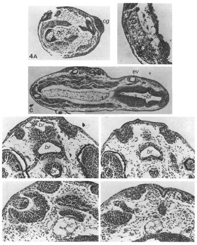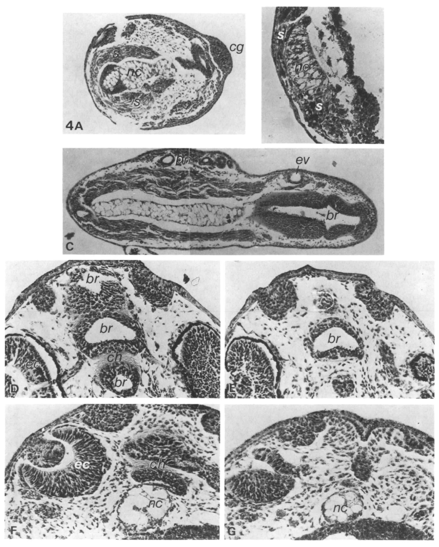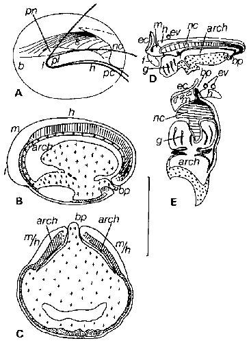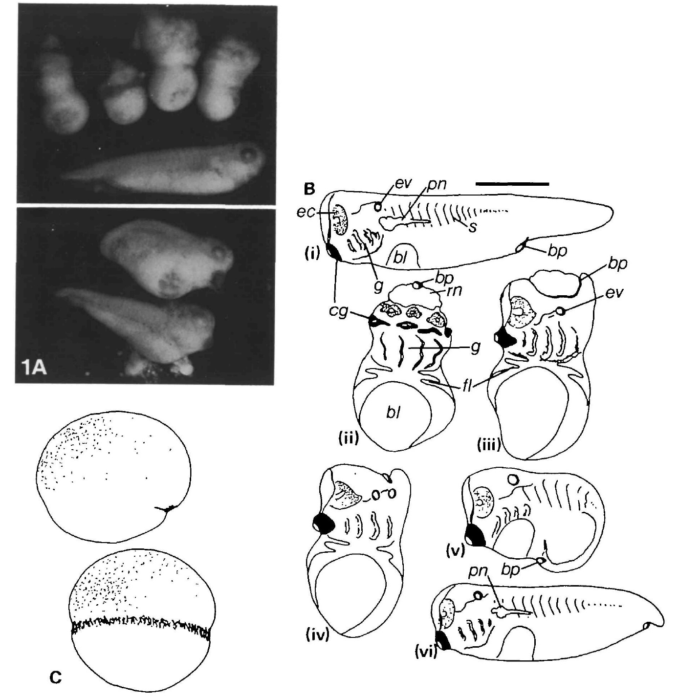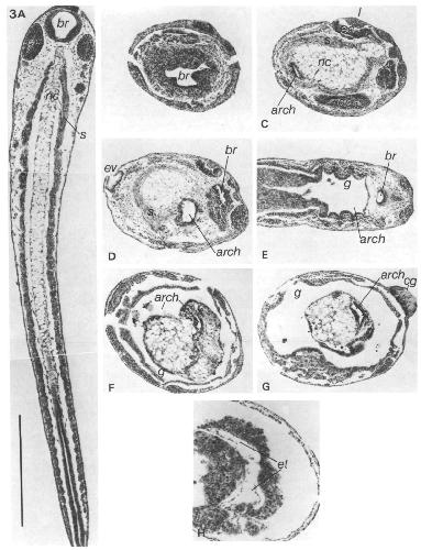 cement gland; ec, eyecup; rn, radial neuralized area; ev, ear vesicle; g, gill architecture;