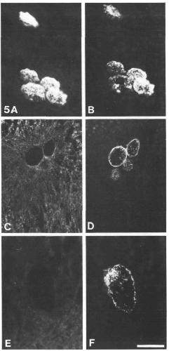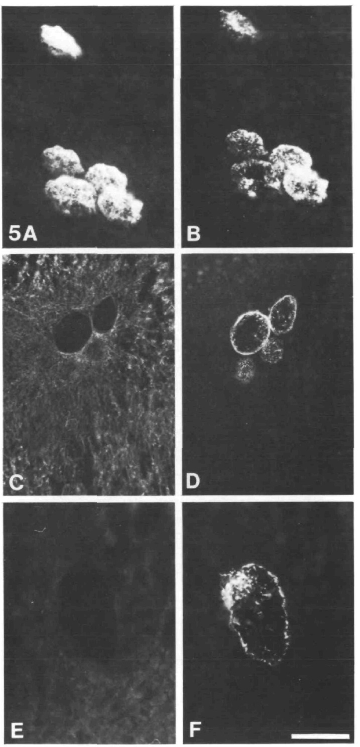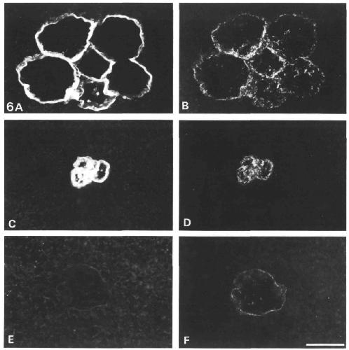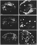 stained with mAB b7-lA9 that binds to nucleoplasmin. Details of the sections shown in the left panels (A,C,E) are