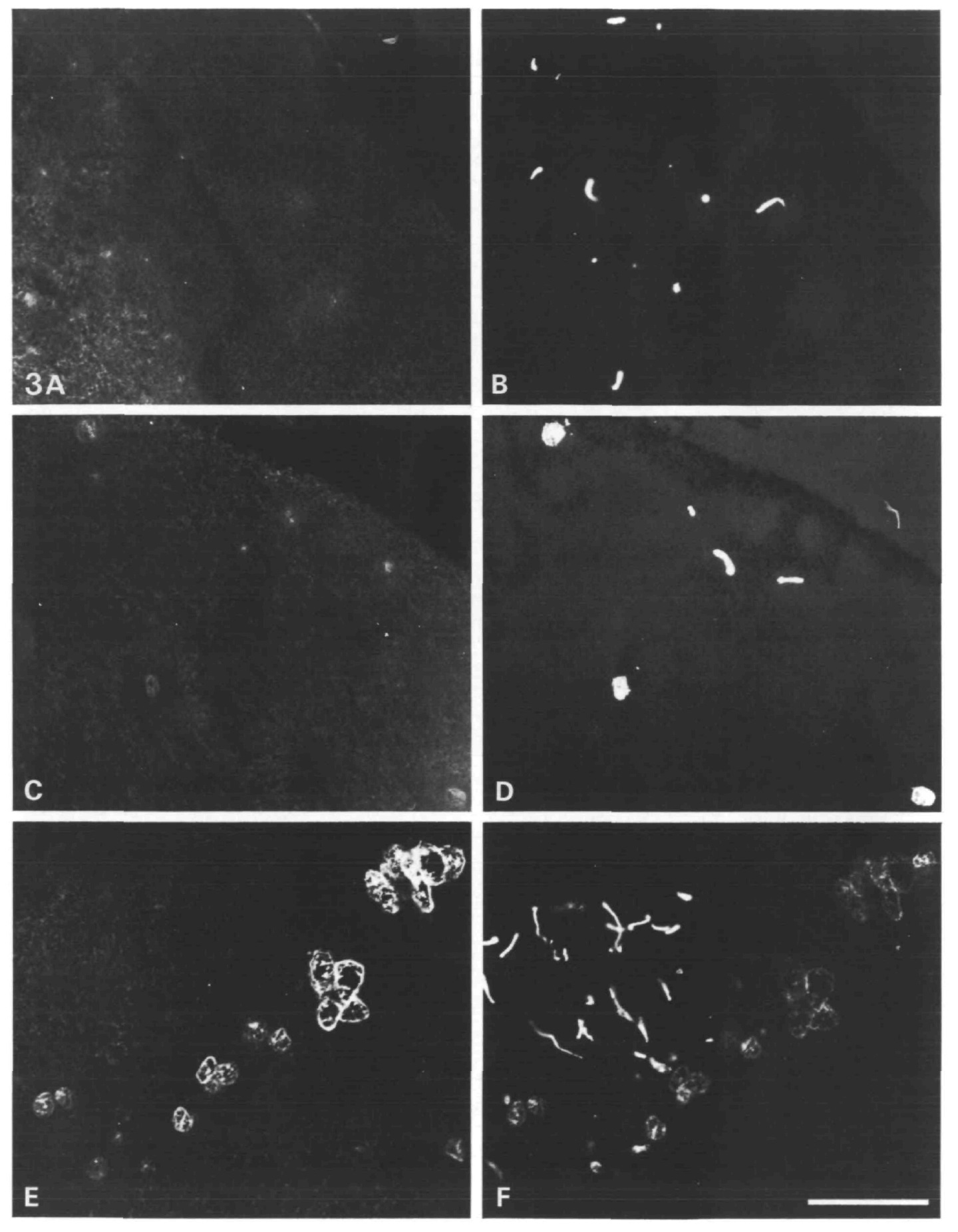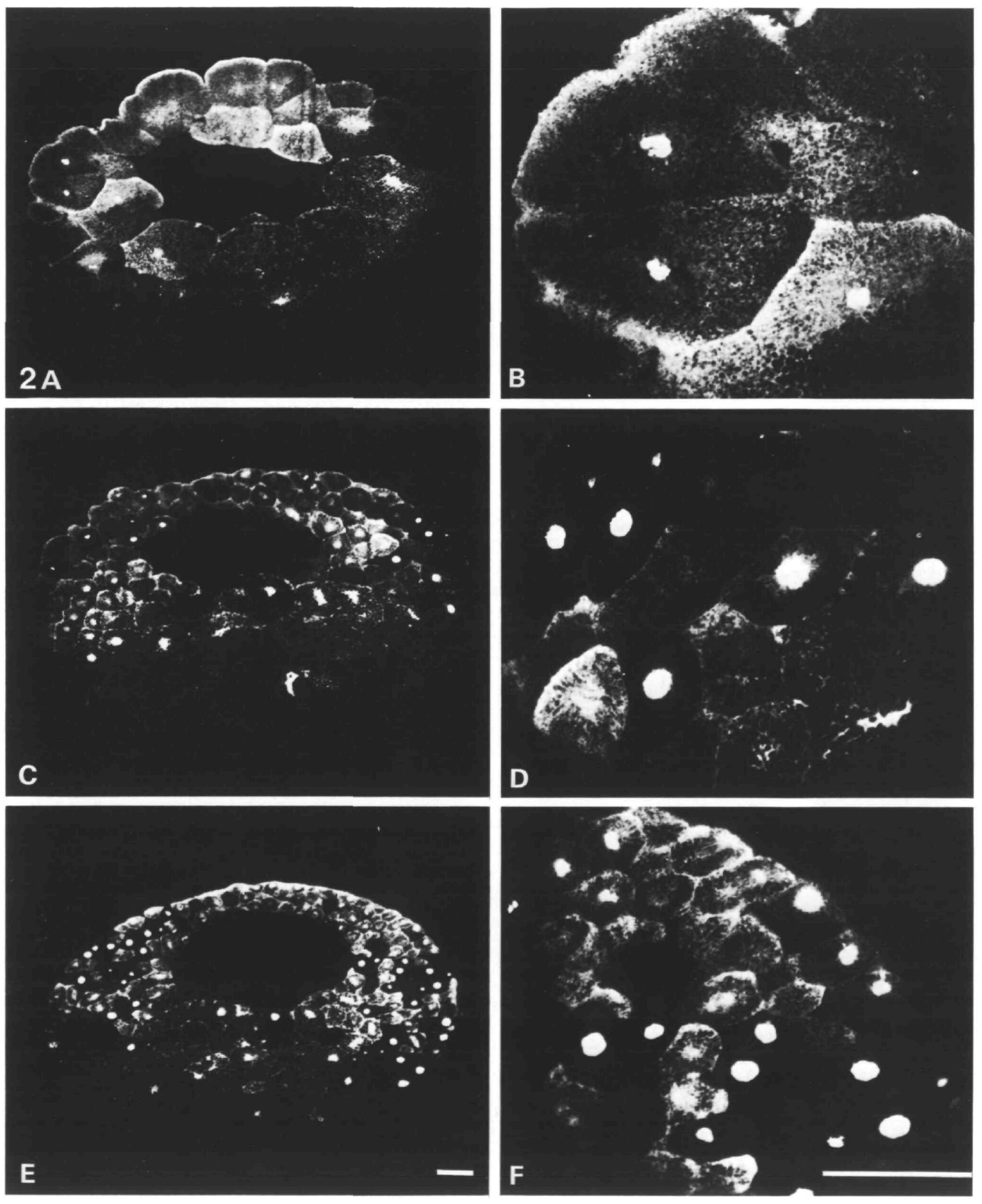 (E). Counterstaining of the same sections with DAPI is shown in the right panels (B,D,F). Bar 50m.