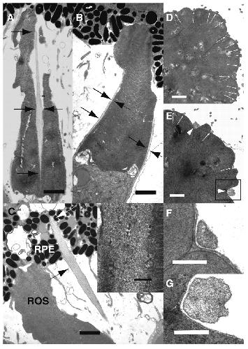 Fig.3. Expression of the GFP:Myo3A transgene results in the formation of abnormally large rod calycal processes. Rods from a GFP:Myo3A transgenic retina contain thicker rod calycal processes (A,C, black arrows; E, white arrowheads) than those found in wild-type rods (B,D, arrows). In addition, a calycal process from a GFP:Myo3A rod protrudes into the RPE layer and extends beyond the normal distal boundary seen in wild-type rod calycal processes (C, arrow). Actin filament bundles are visible in a longitudinal section through an enlarged calycal process found in a GFP:Myo3Aretina (C, inset). Cross-sections of rod outer segments from wild-type (D) and GFP:Myo3A transgenic tadpoles (E) contain numerous normal-sized calycal processes (white arrows) but two abnormally large calycal processes are observed in the GFP:Myo3Aretina (white arrowheads). Actin filament bundles are present in rod calycal processes of a wild-type retina (F) and of the GFP:Myo3Aretina (G; boxed region in E), but there are fewer actin filament bundles visualized in the wild-type calycal process compared with the enlarged calycal process in the GFP:Myo3Aretina. Scale bars: (A-C) 2 μm; (inset in C) 0.2 μm; (D,E) 1 μm; (F,G) 0.25 μm.