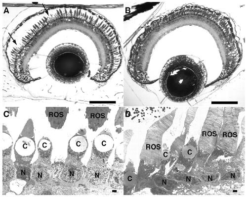 Fig.5. Retinas containing the GFP:Myo3A transgene have reduced numbers of rod photoreceptors compared with cones. (A) GFP:Myo3Aretina with areas that have reduced numbers of rods (arrows) compared with other regions within the retina and to wild-type retina (B). The other retinal layers in the transgenic eye are unaffected by the transgene. (C) The GFP:Myo3Aretina contains predominantly cone photoreceptors (C) that are characterized by lipid droplets in their inner segment and fewer rods. No rod inner segments and only a few rod outer segments (ROS) are observed in the transgenic retina unlike the greater number of intact rod inner and outer segments interspersed with cones found in a wild-type retina (D). N, nucleus. Scale bars: (A,B) 100 μm; (C,D) 1 μm.