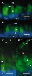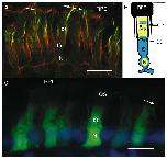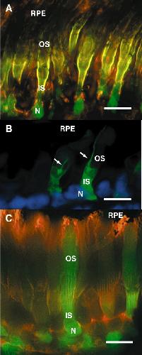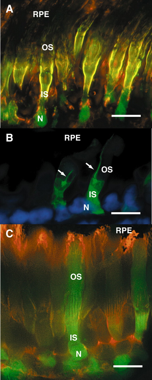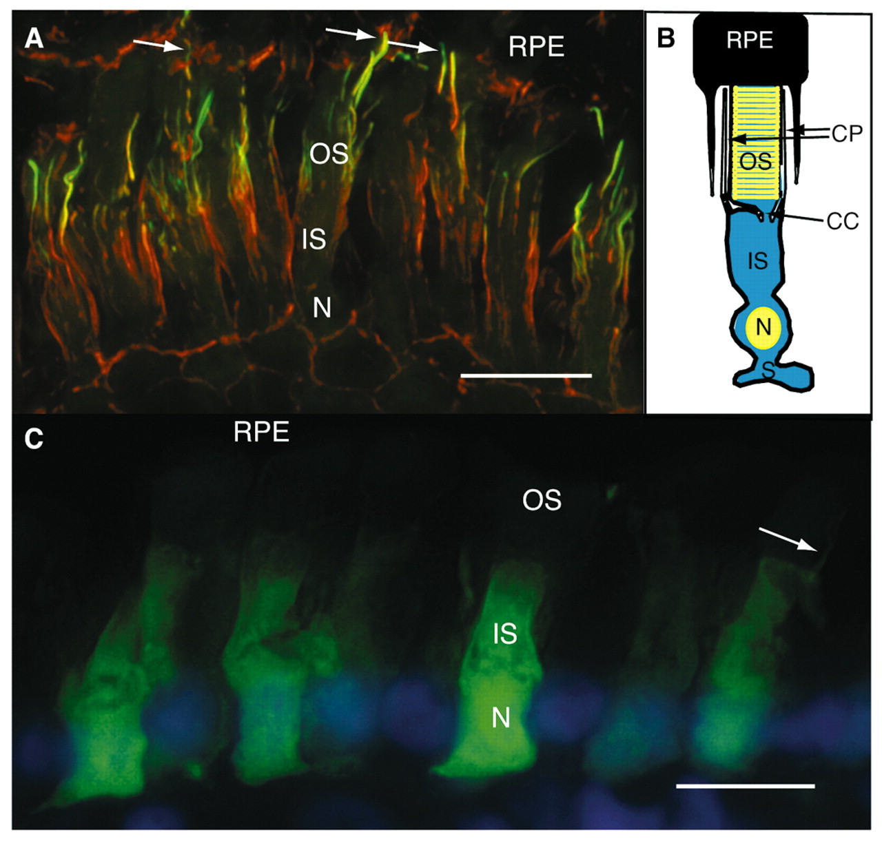 Fig.2. Transgenic Myo3A fusion protein localizes to the distal end of Xenopus rod inner segment actin filament bundles. The entire Myo3A protein fused to the C-terminal of GFP (GFP:Myo3A) was used to make transgenic Xenopus that express the transgene in rod photoreceptors using a modified Xenopus rod opsin promoter. (A) In a section from a GFP:Myo3A transgenic tadpoleretina stained with Texas-Red phalloidin to visualize actin filament bundles, GFP:Myo3A (green) accumulates at the distal end of phalloidin-stained actin filament bundles (red). Arrows indicate the presence of the fusion protein at the distal end of actin filament bundles that protrude into the retinal pigmented epithelium (RPE). No fluorescence was detected in the rod nuclei (N). (B) Diagram of the structural features of rod photoreceptors and the overlying RPE layer in retinal sections of the photoreceptor. OS, outer segment; CP, calycal processes; IS, inner segment; CC, connecting cilium; N, nucleus; S, synapse. Actin filament bundles in photoreceptors extend from the inner segment and terminate in the calycal processes surrounding the proximal outer segment in rod photoreceptors. (C) A retinal section from a control GFP transgenic tadpoleretina exhibits fluorescence in rod nuclear (labeled with DAPI, blue) and cytosolic (inner segment, synapse and connecting cilium) compartments of rods. The arrow in panel C indicates fluorescence in the connecting cilium. Scale bar: 10 μm.