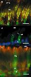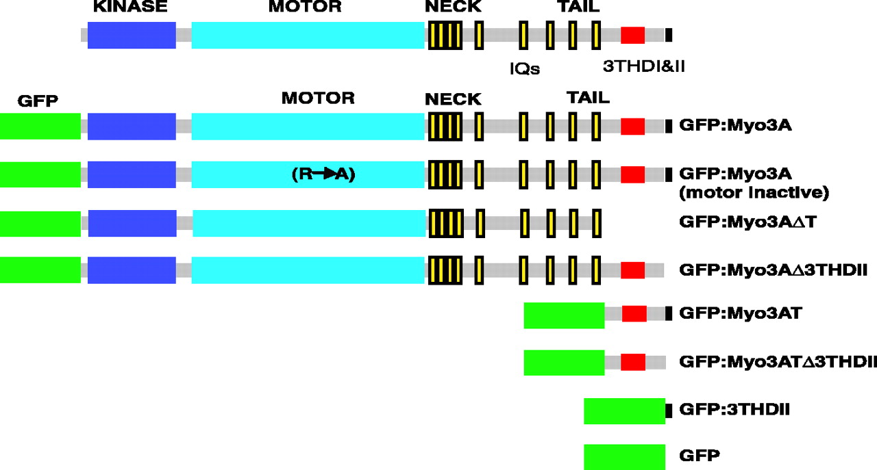 Fig.1. Schematic diagram of whole myosin 3A and myosin 3A transgenes. Shown at the top is Myo3A with its kinase (purple), motor (blue), nine IQ motifs (yellow), and tail domains 3THDI (red) and 3THDII (black). Below Myo3A are the various Myo3A transgenes that were fused to the C terminus of GFP (green) and expressed in Xenopus tadpole rods: the entire Myo3A protein (GFP:Myo3A), Myo3A with the motor inactivated by mutation (GFP:Myo3A â motor inactive), Myo3A with the tail beyond the IQ motifs deleted (GFP:Myo3AδT), Myo3A with 3THDII domain deleted (GFP:Myo3Aδ3THDII), the Myo3Atail fragment (GFP:Myo3AT), the Myo3Atail with 3THDII deleted (GFP:Myo3ATδ3THDII), and the Myo3Atail domain 3THDII (GFP:3THDII). The GFP transgene alone was expressed as a control.