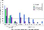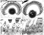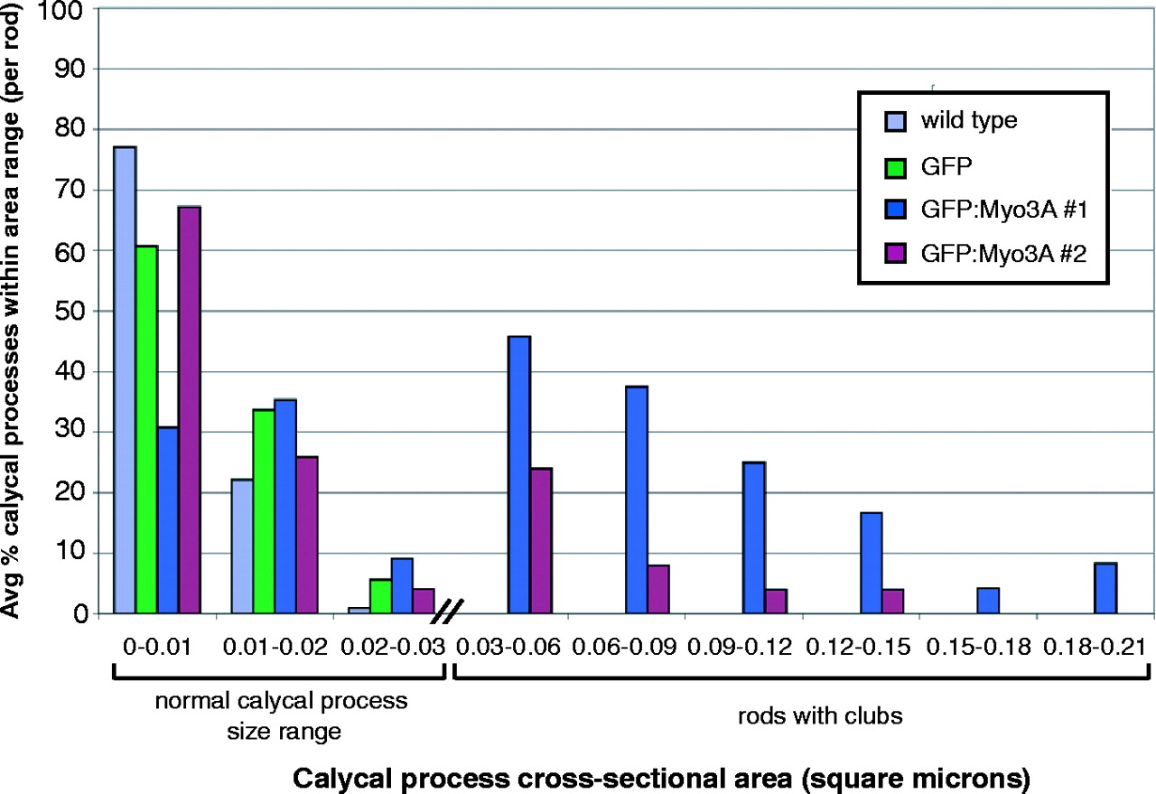 Fig.4. GFP:Myo3A transgenic retinas contain rod calycal processes with increased cross-sectional area. Cross-sections of rods from two GFP:Myo3A, a wild-type and GFP control retina similar to those shown in Fig. 3D and E were used to measure the cross-sectional area of calycal processes from randomly chosen rods. For each rod, the calycal processes were categorized by size (cross-sectional area), and the average percentage of calycal processes per rod within a cross-sectional area range was plotted for each experimental and control tadpoleretina. Note that the first three bins on the x-axis represent 0.01 μm2 and together represent the size of the remaining six bins (0.03 μm2). Rod calycal processes with cross-sectional areas less than 0.03 μm2 were seen in both control and experimental retinas, but only rods from the two GFP:Myo3A transgenic tadpoles contained calycal processes larger than 0.03 μm2. In the wild-type and GFP control retinas most of the calycal processes had cross-sectional areas less than 0.01 μm2 but a few were in the ranges 0.01-0.02 and 0.02-0.03 μm2. Therefore, any calycal processes less than 0.03 μm2 in cross-sectional area are within the normal range, while those greater than 0.03 μm2 are defined as being clubs, since calycal processes of this size are never found in wild-type or control rods.