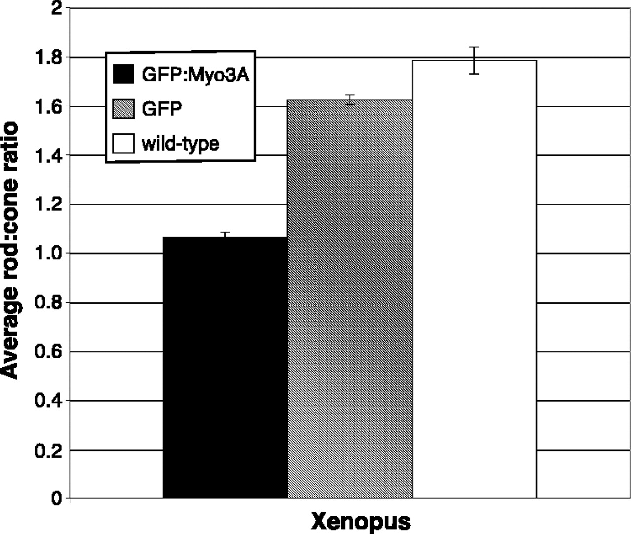 Fig.6. Expression of transgenic GFP:Myo3A causes rod cell death in the retina. Three to four 0.5 μm sections from transgenic and control tadpole retinas were counted to determine the average rod:cone ratio for retinas from GFP:Myo3A (black), GFP (gray) and wild-type (white) tadpoles. The average rod:cone ratio in GFP:Myo3A transgenic retina (1.06±0.020, n=18 tadpole retinas) was reduced compared with control GFP transgenic (1.62±0.020, n=15 tadpoles retinas) and wild type (1.78±0.056, n=14 tadpole retinas) retina. The reduction in the rod:cone ratio from GFP:Myo3A retinas compared with either GFP or wild-type retinas was statistically significant (P<0.001) presumably because of the death of rods expressing the Myo3A transgene. There was no difference in average rod:cone ratios of control transgenic GFP and wild-type retinas. Error bars, standard error of the mean.