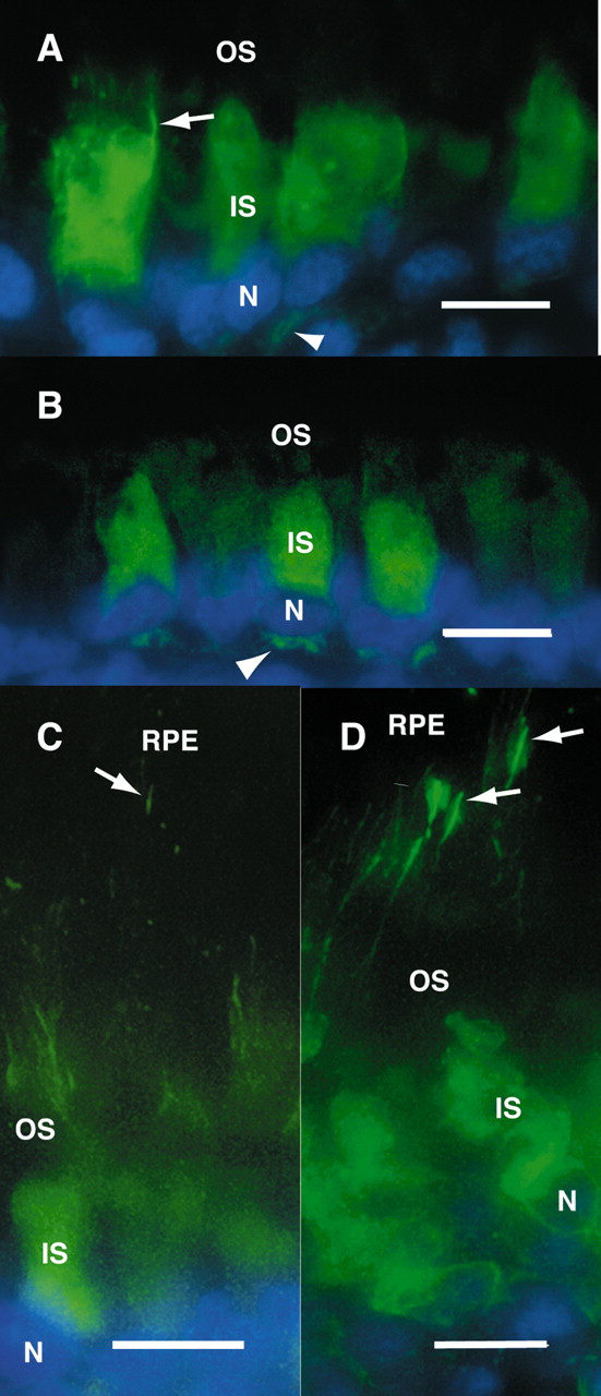 Fig.7. Motor activity and the Myo3Atail are required for Myo3A localization to the distal end of inner segment actin filament bundles. (A) A retinal section from a transgenic tadpole containing the GFP:Myo3A (motor-inactive) protein displayed fluorescence in the inner segment (IS), connecting cilium (arrow) and synapse (arrowhead). (B) Deletion of the Myo3Atail (GFP:Myo3AδT) also resulted in fluorescence confined to the cytosol of the rod inner segment, connecting cilium and synapse. (C) Fluorescence from a GFP:Myo3A transgene with a deletion of the 22 amino acid 3THDII domain (GFP:Myo3Aδ3THDII) localized to inner segment actin filament bundles (arrow) but also displayed extensive levels of fluorescence in the inner segment cytosol and synapse. (D) In addition to cytosolic fluorescence, an accumulation of fluorescence from GFP:Myo3Aδ3THDII was also observed in the distal ends of actin filament bundles (arrows). None of the nuclei of transgenic retinas exhibited fluorescence (N, blue DAPI label). RPE, retinal pigmented epithelium; OS, outer segment. Scale bar: 10 μm.