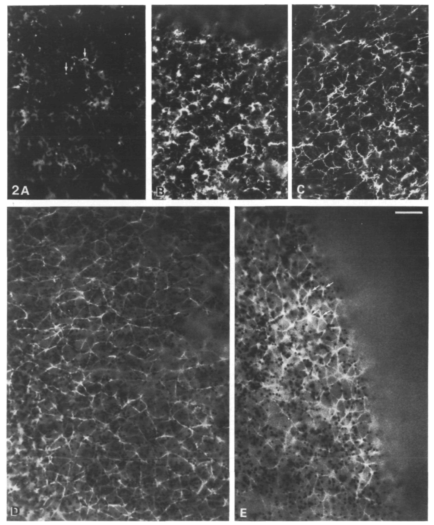 precision (E). Arrows in part E mark vertices of the cytokeratin lattice. The bar in part E marks 10/im for all parts.