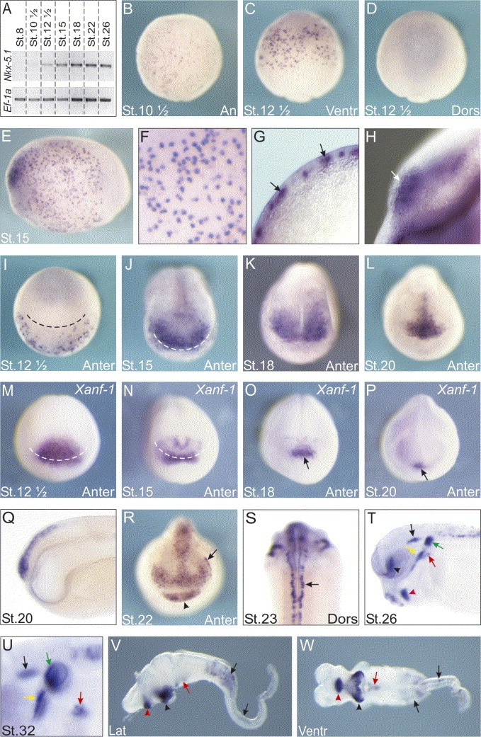 Fig. 2. The analysis of temporal and spatial expression patterns of X-nkx-5.1. (A) RT-PCR assay of X-nkx-5.1 expression at the stages indicated. (BâL, QâW) In situ hybridization analysis of spatio-temporal expression of X-nkx-5.1. (B) At stage 10 1/2 the expression is detected in scattered cells of the animal hemisphere. (C) Scattered epidermal cells at the ventral side of the embryo at stage 12 1/2 continue to express X-nkx-5.1 even stronger than at stage 10 1/2. (D) At stage 12 1/2 the X-nkx-5.1 expression is absent at the dorsal side of embryo. (E,F-close-up.) Expression of X-nkx-5.1 in the scattered epidermal cells continues during neurulation. (E) The whole embryo at the midneurula stage (anterior to the left). (F) The fragment of the epidermis of the embryo at the midneurula stage. (G) Epidermal cells expressing X-nkx-5.1 (arrows) are localized exclusively in the internal layer (the horizontal cut of embryo at stage15). (H) The saggital section of embryo at the end of neurulation. The X-nkx-5.1 expression in the anterior neural fold is marked by the white arrow. (IâL) Anterior views of the embryos (dorsal up) at successive stages between the end of gastrulation and the end of neurulation show gradual increase of the X-nkx-5.1 expression in the anteriorneurectoderm and headepidermis. Note that no expression could yet be seen in the anteriorneurectoderm at the end of gastrulation (I). The dotted lines on I and J indicate the approximate position of the anterior margin of the neural plate). (MâP) Anterior views of the embryos hybridized at the same stages as shown on I-L with the Xanf-1 mRNA probe. This row demonstrates a negative correlation between the time courses of Xanf-1 and X-nkx-5.1 expression: in contrast to X-nkx-5.1, Xanf-1 is intensively expressed in the presumptive anteriorneurectoderm at the end of gastrulation (M), but its expression is gradually declined thereafter (NâP). The dotted lines on M and N indicate approximate position of the anterior margin of the neural plate. The Xanf-1 expression in the primordium of the anteriorpituitary is shown by the arrows. (Q) After the neural fold closing X-nkx-5.1 expression is detected in the anterior side of neural tube and spreads along the dorsal side. (R) The expression of X-nkx-5.1 within the area of the headepidermis at stage 22. The arrow shows the expression in the otic ganglion and the arrowhead-the expression in the cement gland. (S) At stage 23 the longitudinal row of scattered cells expressing X-nkx-5.1 is revealed on both side of neural cord (arrow). (T,U) At the tailbud stage, the X-nkx-5.1 expression increases in two domains of the neural tube: one in the prospective forebrain (see the arrowhead) and the other in the ventralmesencephalon (the black arrow). It also sharply increases in the anterior part of otic vesicle (the green arrows), in otic ganglion (the yellow arrows) and in the areas, corresponding to the middle (the red arrows) and anterioventral (the red arrowhead) lateral line placodes. (V,W) At the tadpole stage, the X-nkx-5.1 expression is localized in the ventralforebrain in two domains corresponding to the lamina terminalis (the black arrowheads) and ventralthalamus (the red arrowheads), respectively. The comparatively weak expression is seen in the ventral part of the rostral hindbrain (the red arrows) and in scattered cells within the dorsal and lateral sides of posteriorhindbrain and spinal cord (the black arrows).