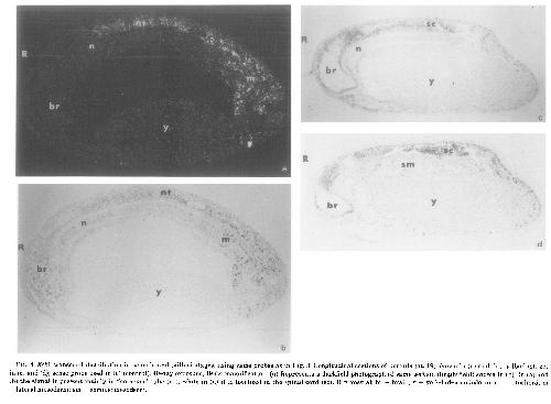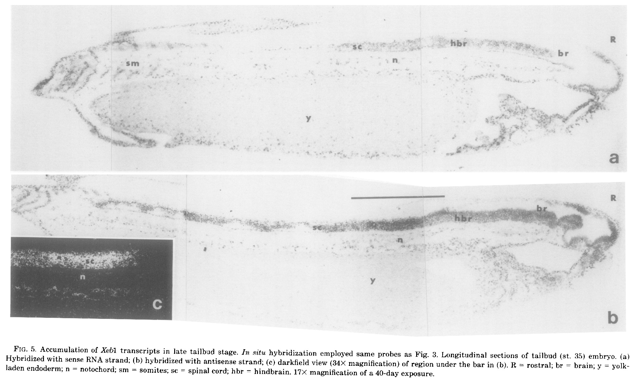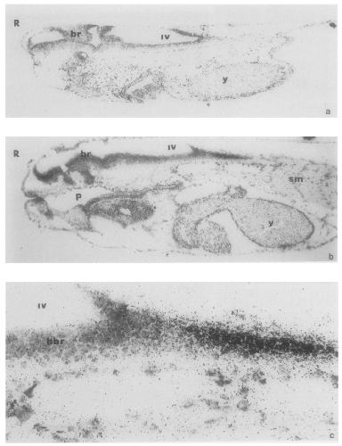 FIG. 6. Restriction of Xebl transcripts to the cervical spinal cord of the swimming tadpole. In silu hybridization (using same probes as Fig. 3) of longitudinal sections of stage 41 larvae. (a) Hybridized with sense RNA strand (control); (b, c) hybridized with antisense strand. (c) Higher magnification (80X) of spinal cord region of (b). Exposed for 40 days. R = rostral; br = brain; y = yolk-laden endoderm; SC = spinal cord; IV = 4th ventricle of brain; hbr = hindbrain; m = mesoderm; n = notochord; sm = somites; p = pharynx.