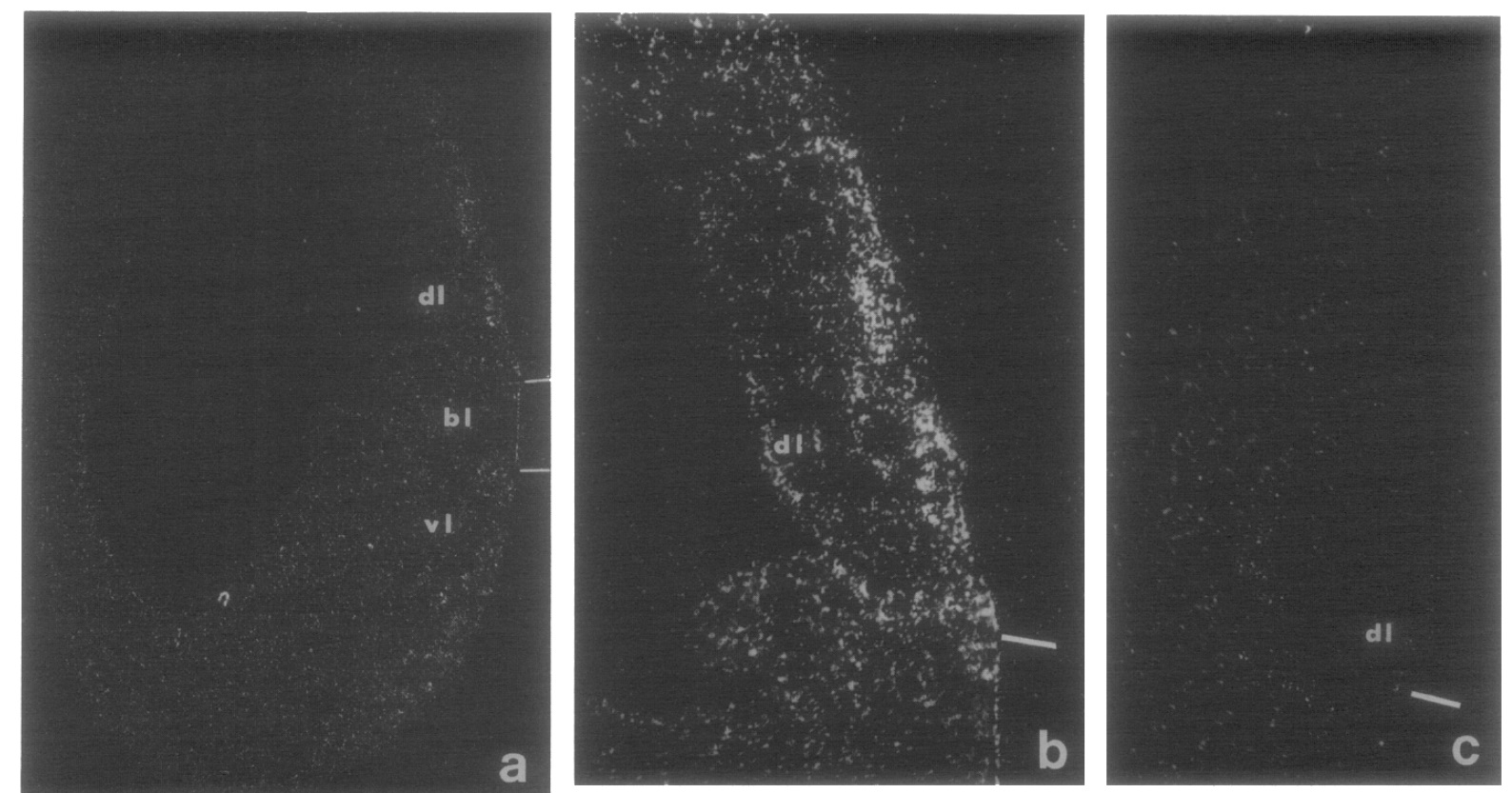 FIG. 3. In situ hybridization localization of Xebl transcript accumulation in gastrulae [st. 12 (Nieuwkoop and Faber, 1956)]. (a) Darkfield photo of in situ hybridization of a sagittal section of a stage 12 gastrula. A 900-bp [%]UTP-labeled RNA probe complimentary to the Xebl coding strand transcript was employed. This section shows both the dorsal and ventral regions around the blastopore (bl). The bars mark the edges of the blastopore. Label can be observed in the dorsal lip (dl) region, but not in the ventral lip (vl) region. 17X magnification of a 40-day exposure. (h) Higher magnification view (66X) of (a), showing label in a limited region of the dorsal lip (IO-day exposure). (c) Section hybridized with the opposite strand (sense probe). No signal could be detected in the dl cells after 40 days exposure. 66x magnification.