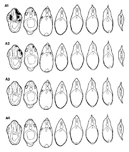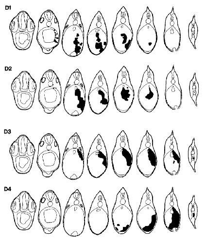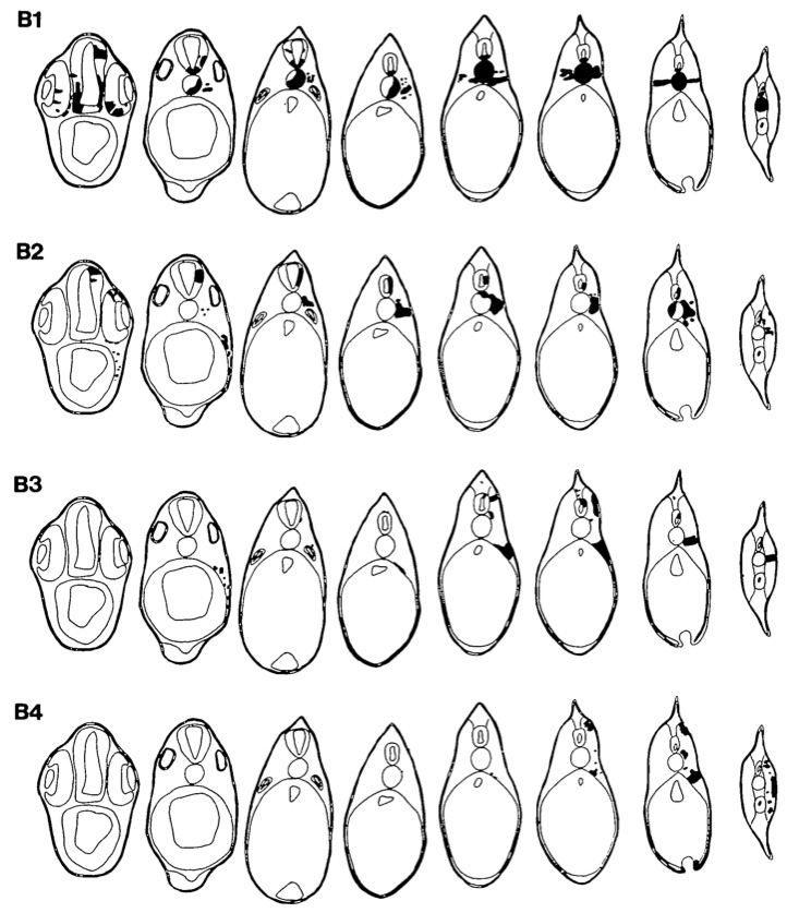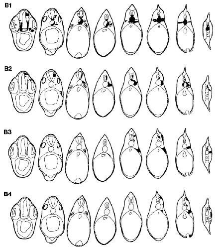 Figure 5. 3D reconstructions of typical cases representing each of the 16 blastomere injections. [B blastomeres]