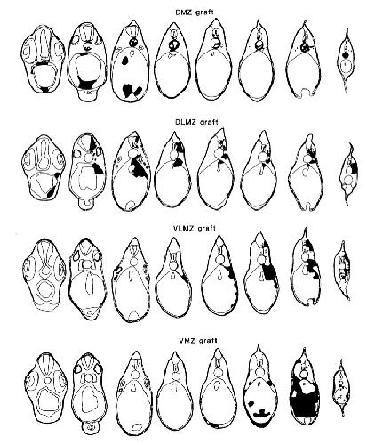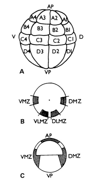 Fig. 1. (A) Nomenclature of blastomeres at the 32-cell stage. D, dorsal; V, ventral; AP, animal pole; VP, vegetal pole. (B) Orthotopic grafts at stage 10 viewed from vegetal pole. (C) Orthotopic grafts viewed in median section. AP, animal pole; VP, vegetal pole; DMZ, dorsal marginal zone; DLMZ, dorsolateral marginal zone; VLMZ, ventrolateral marginal zone; VMZ, ventral marginal zone.