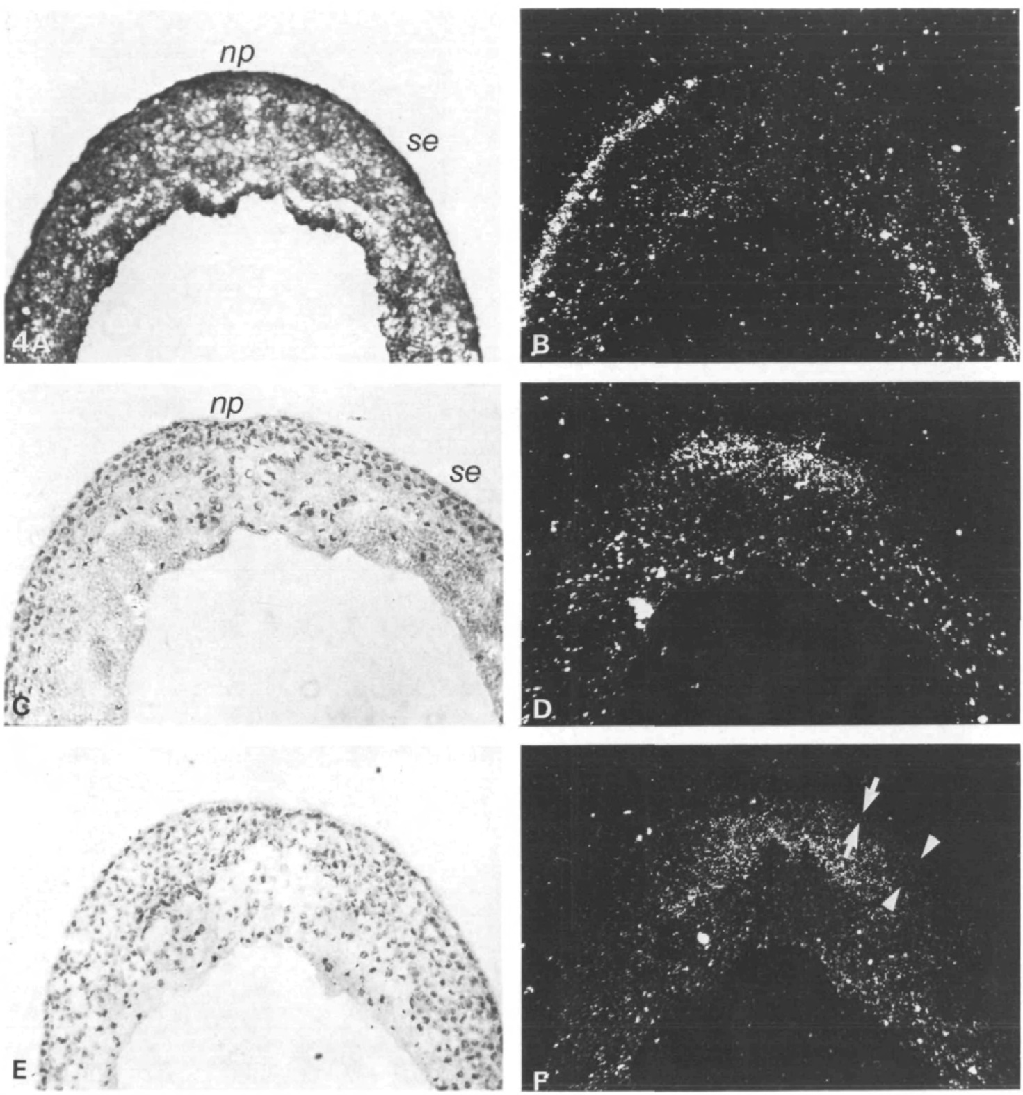 embryo. Note hybridization to the neural plate (np), but not to surrounding ectoderm (se). F shows hybridization of the